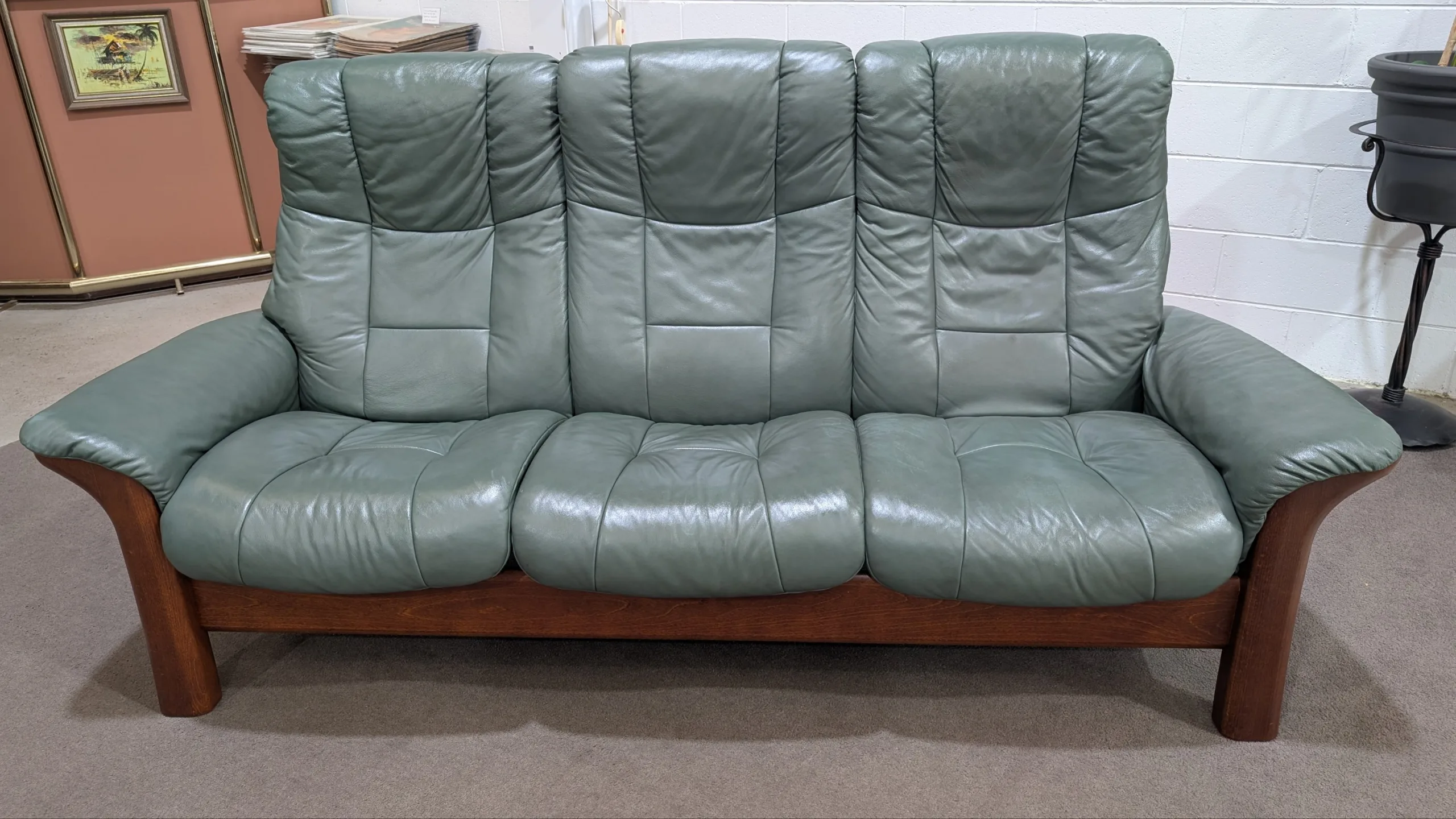 Leather recliner sofa by STRESSLESS in good solid condition. Model is Windsor. Reclining system works easily. Tight frame. Comes with matching footstool. Some minor wear otherwise presents well. Beautiful high end furniture.