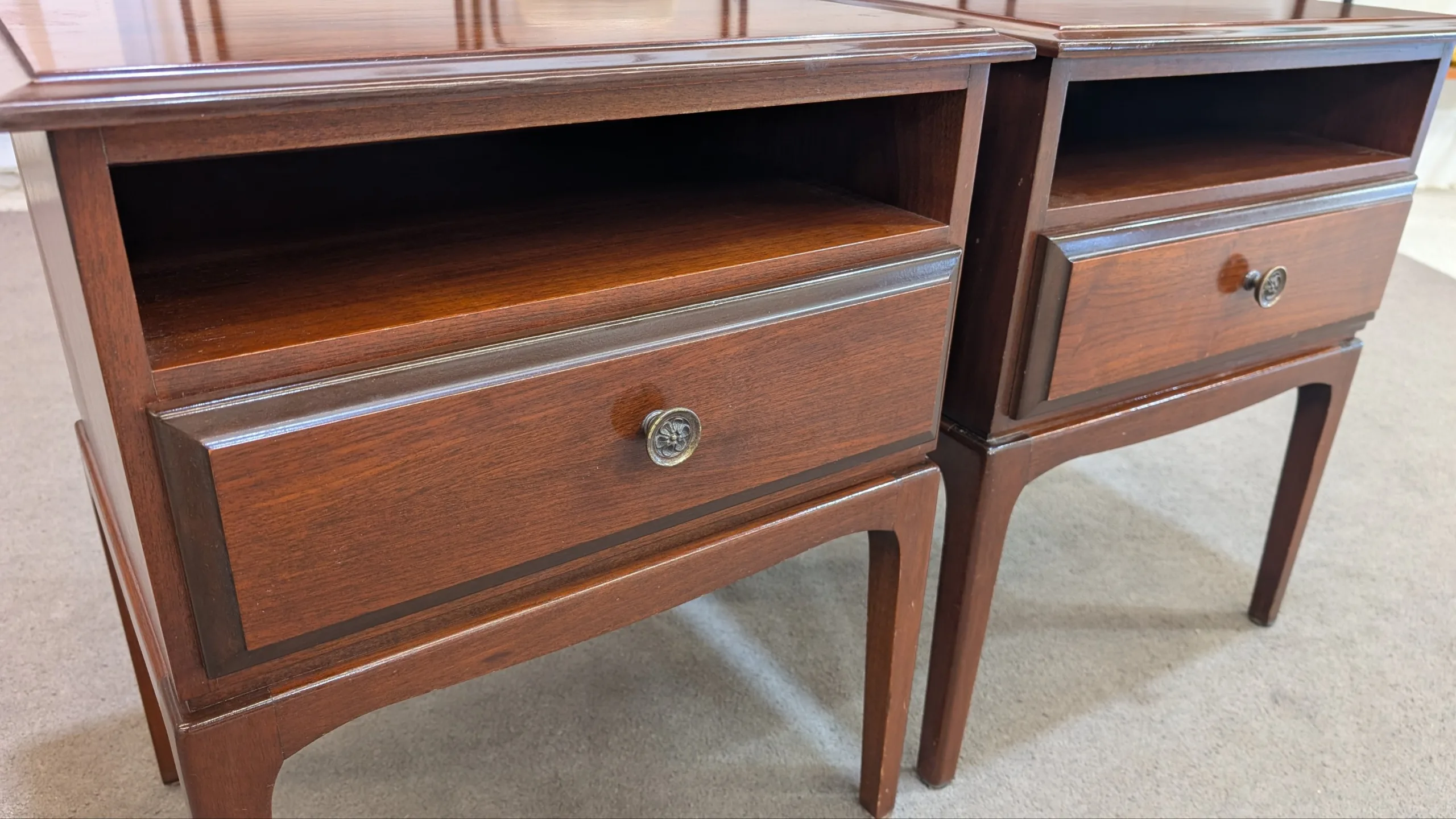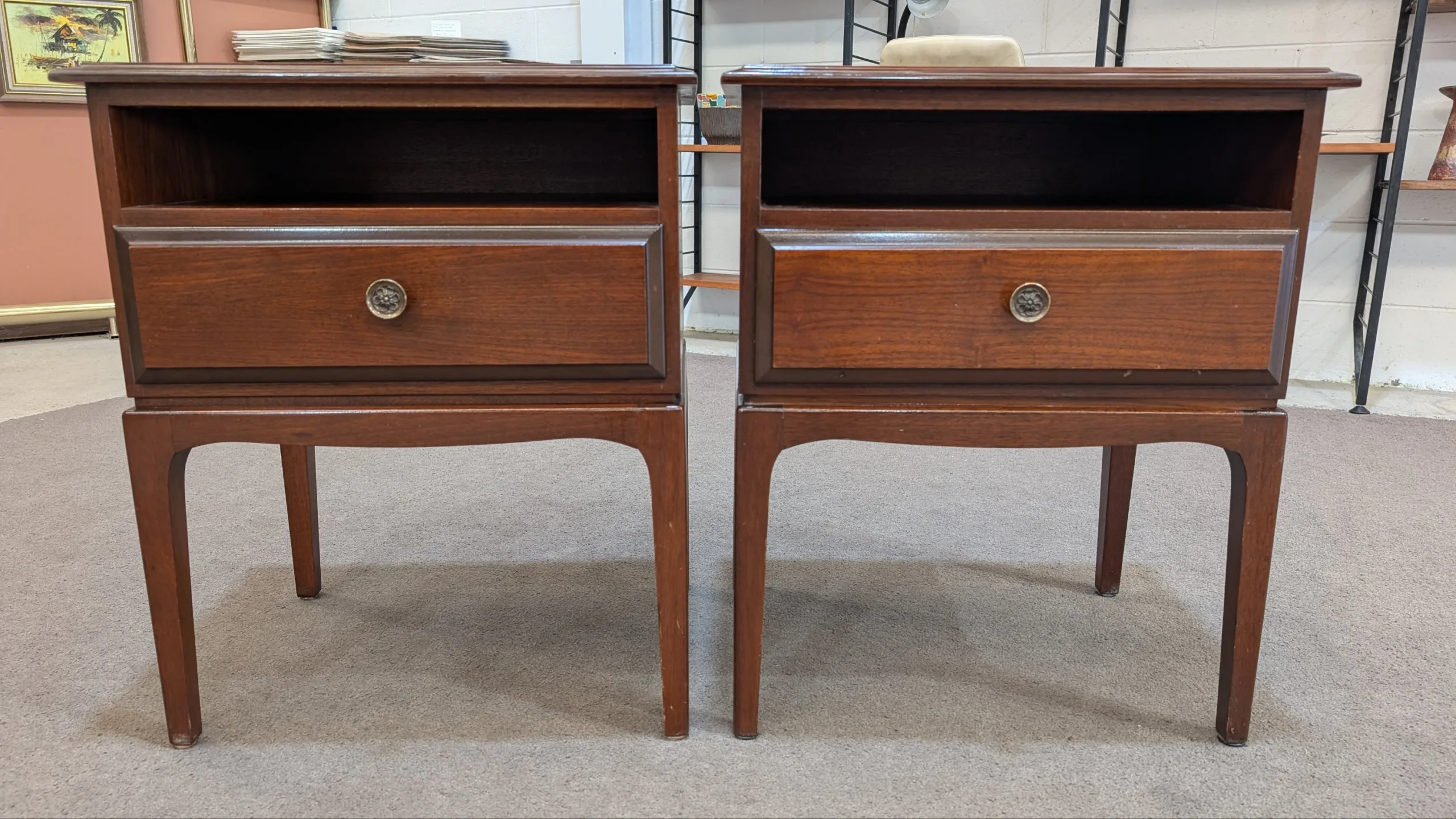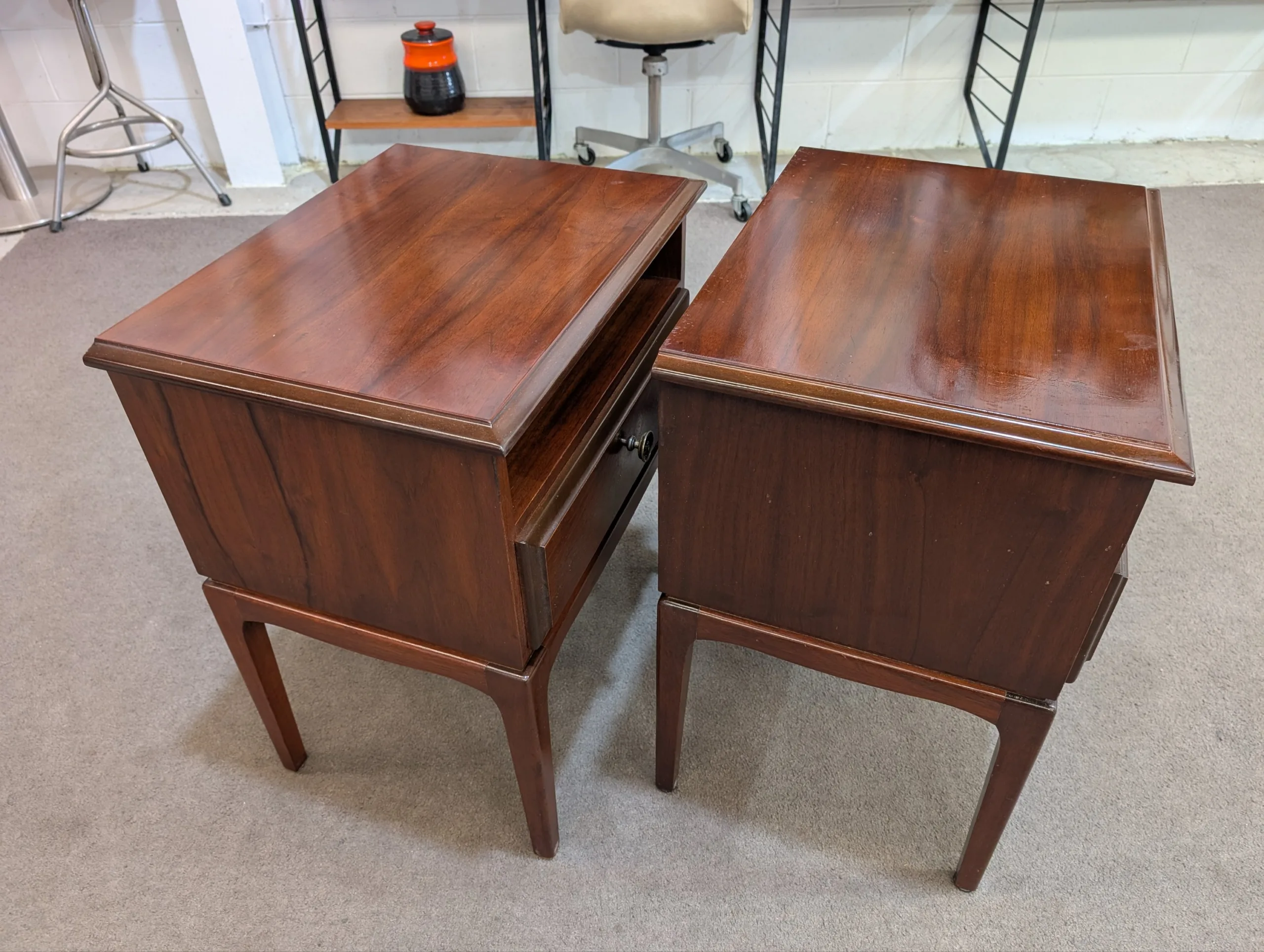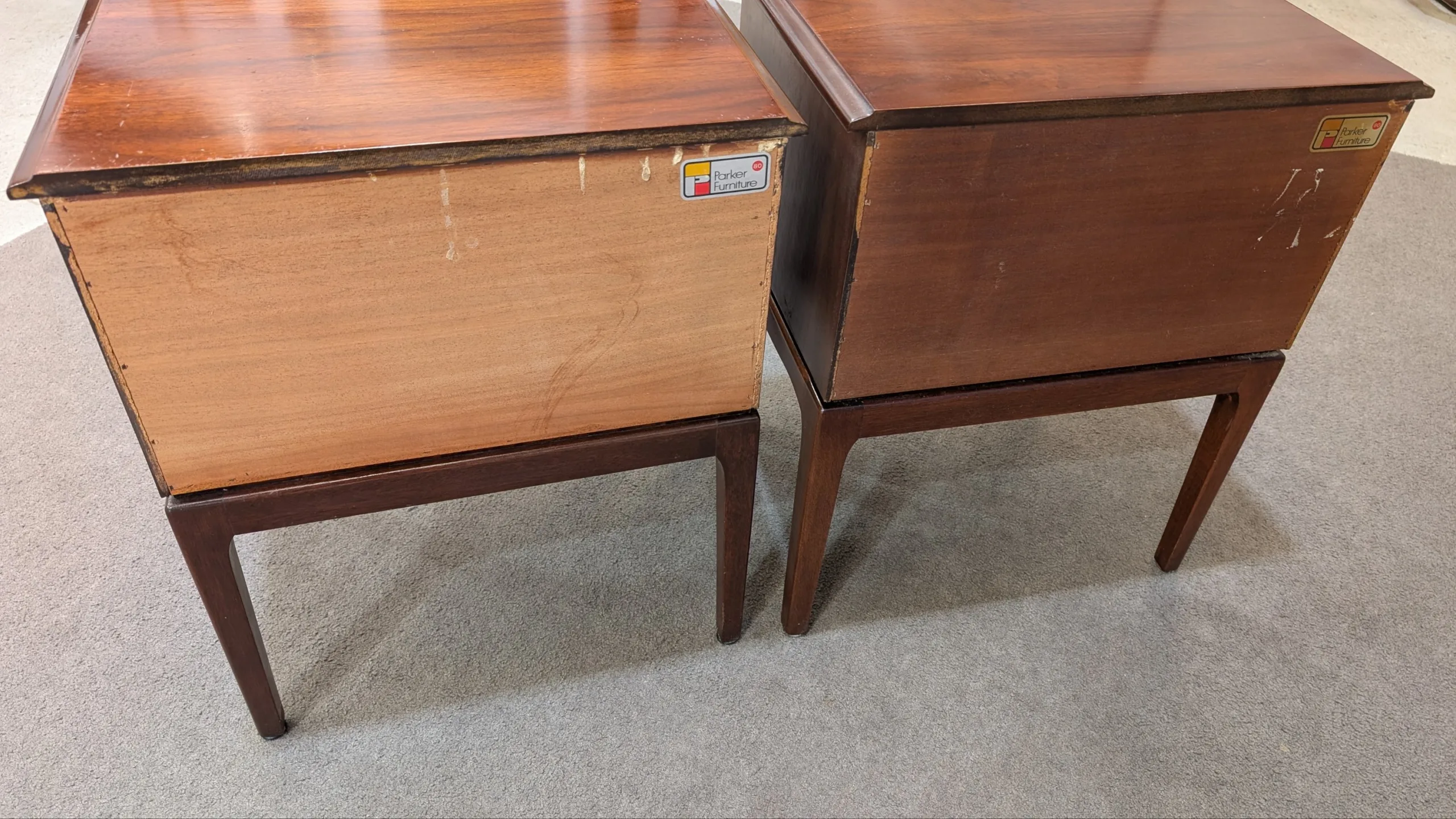 Retro pair of bedsides drawers by Parker in good solid condition. Drawers slide easily with minimal runner wear. Sturdy well made units. Great quality as expected from the maker. Genuine vintage item, not perfect.