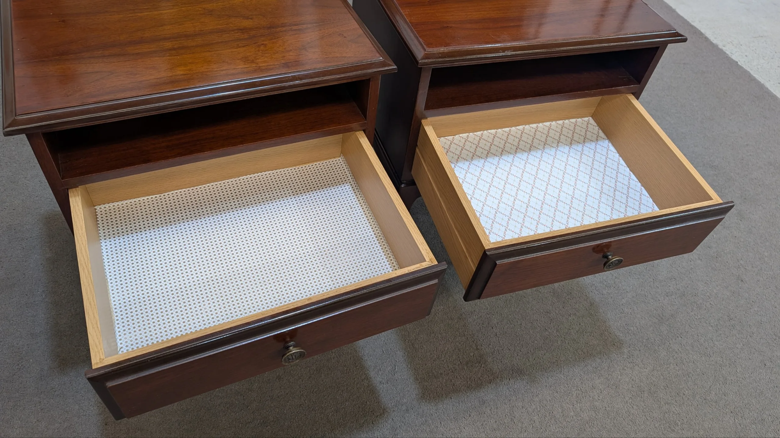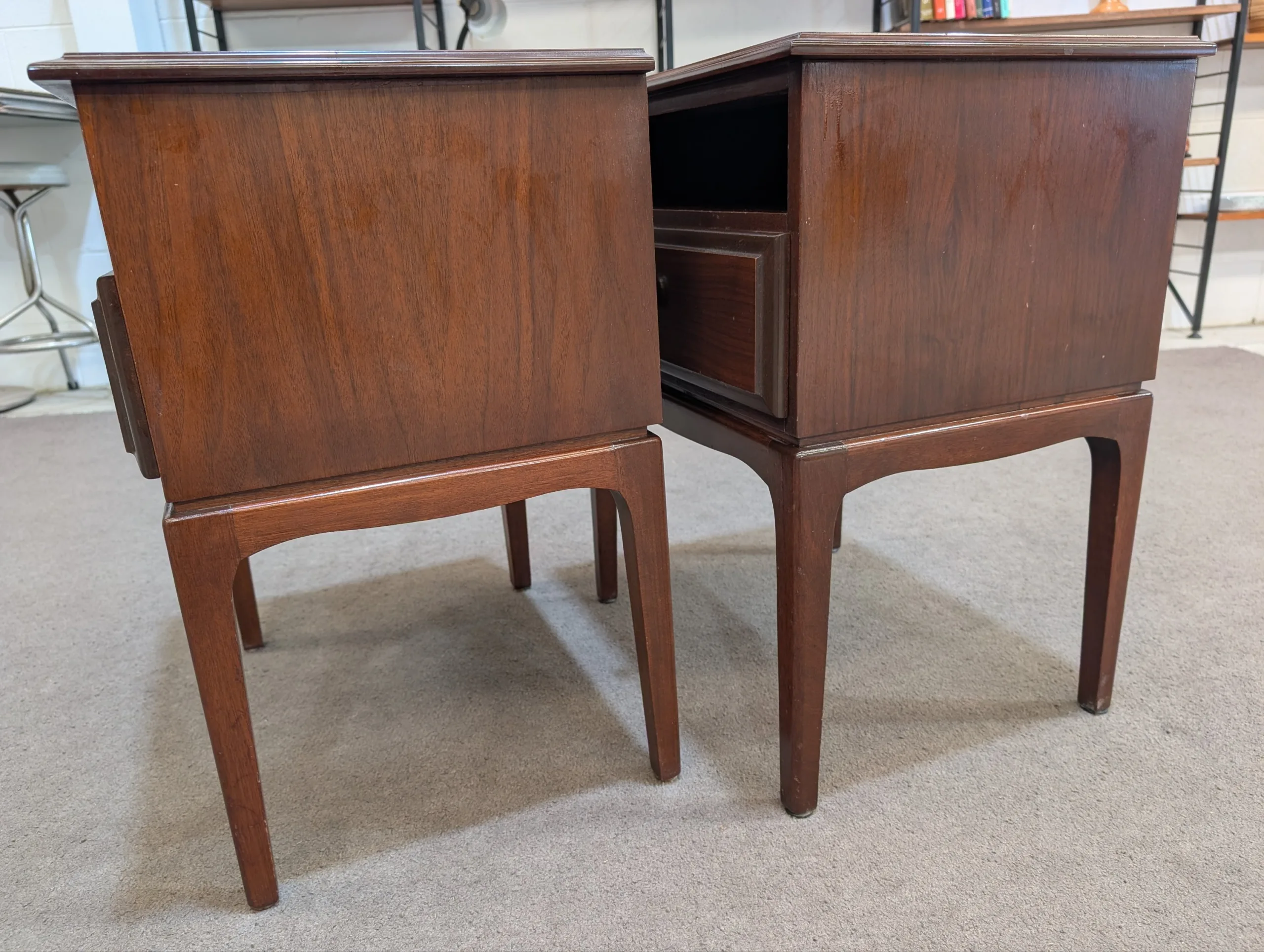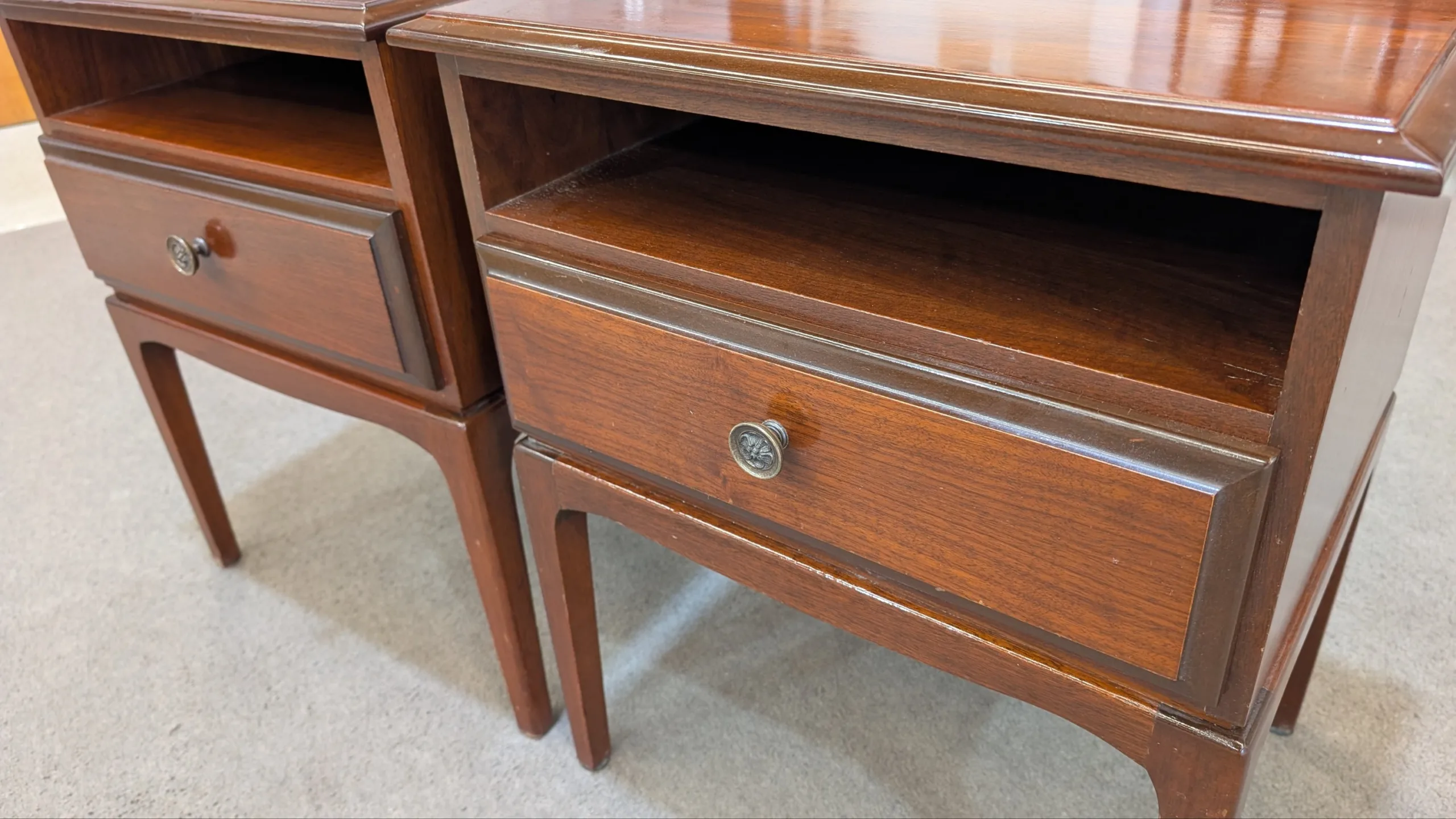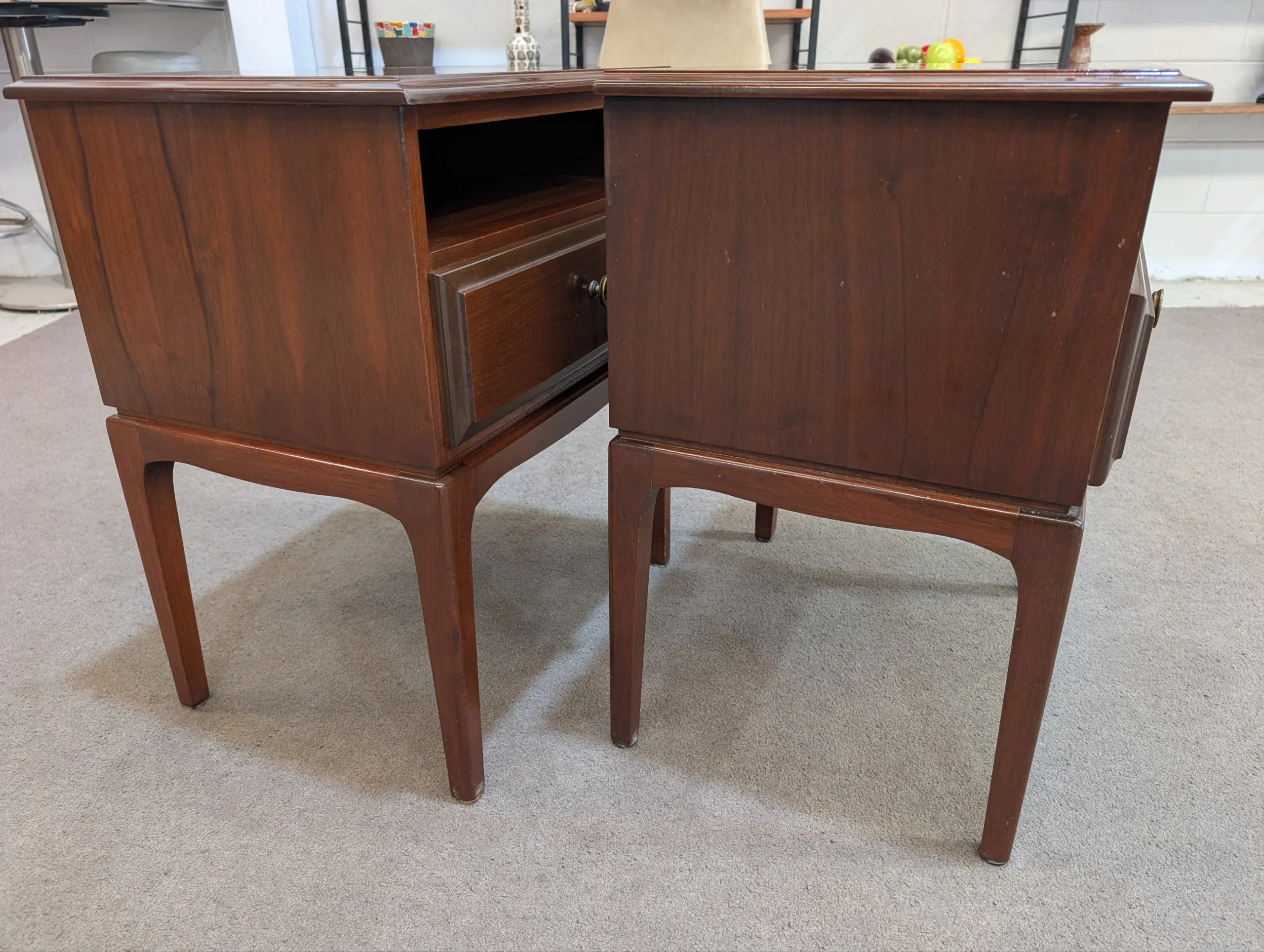 Retro pair of bedsides drawers by Parker in good solid condition. Drawers slide easily with minimal runner wear. Sturdy well made units. Great quality as expected from the maker. Genuine vintage item, not perfect.
