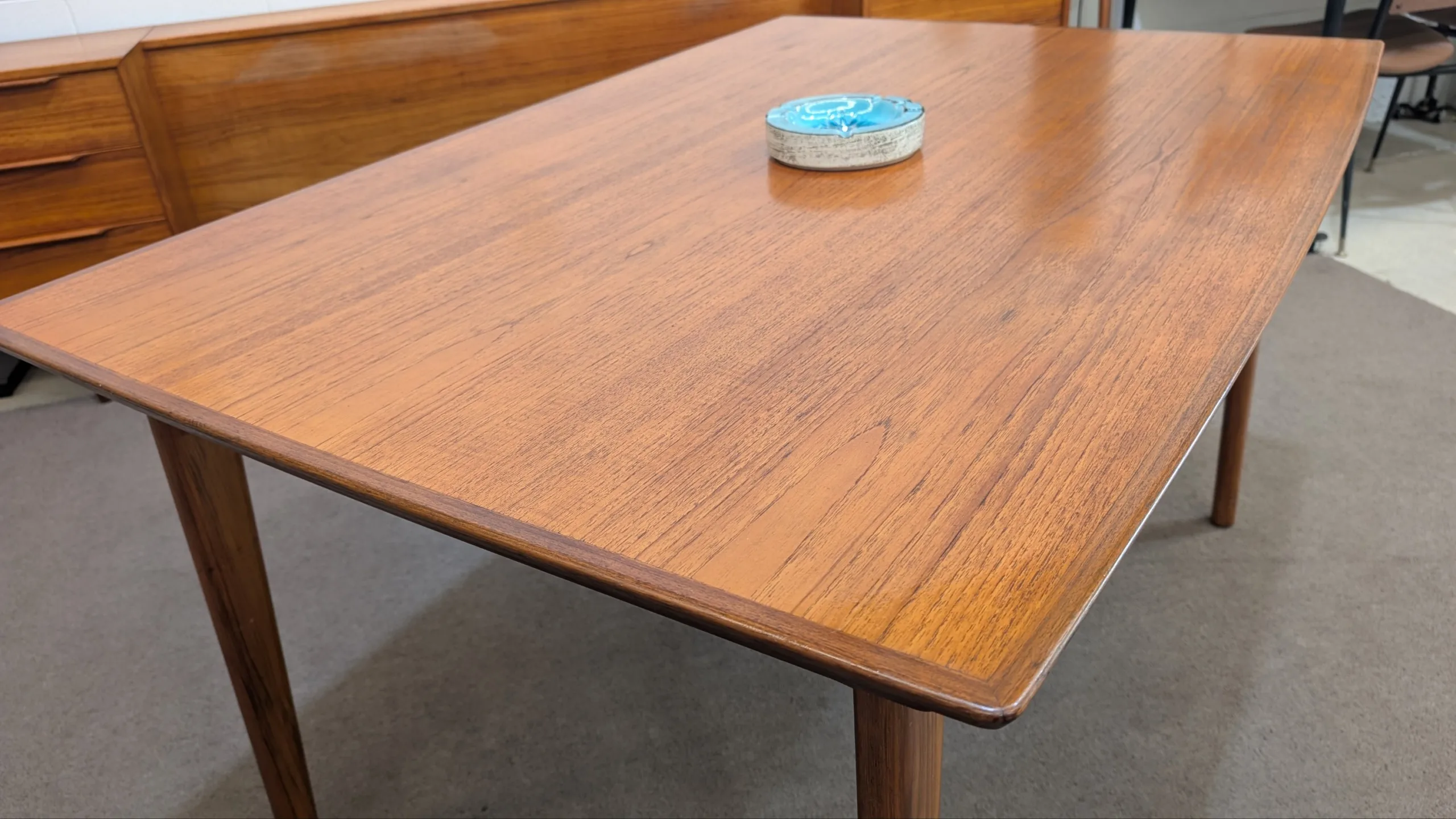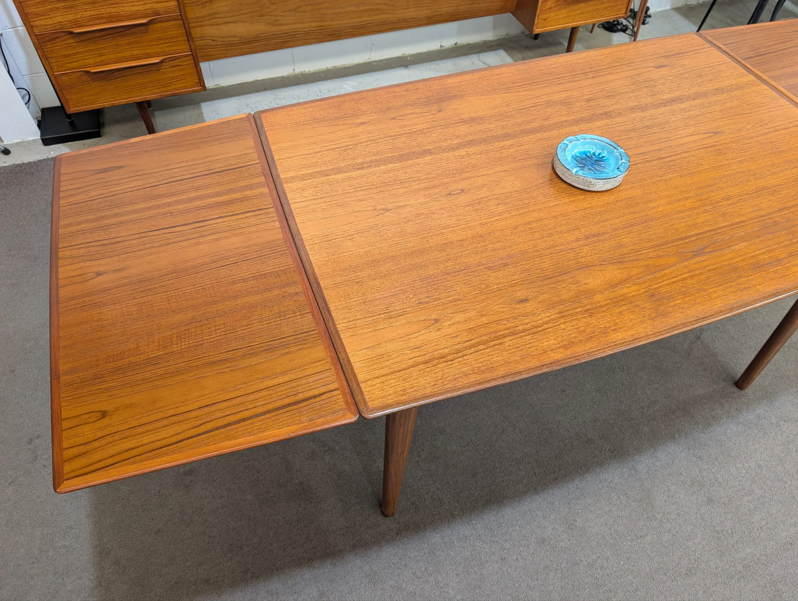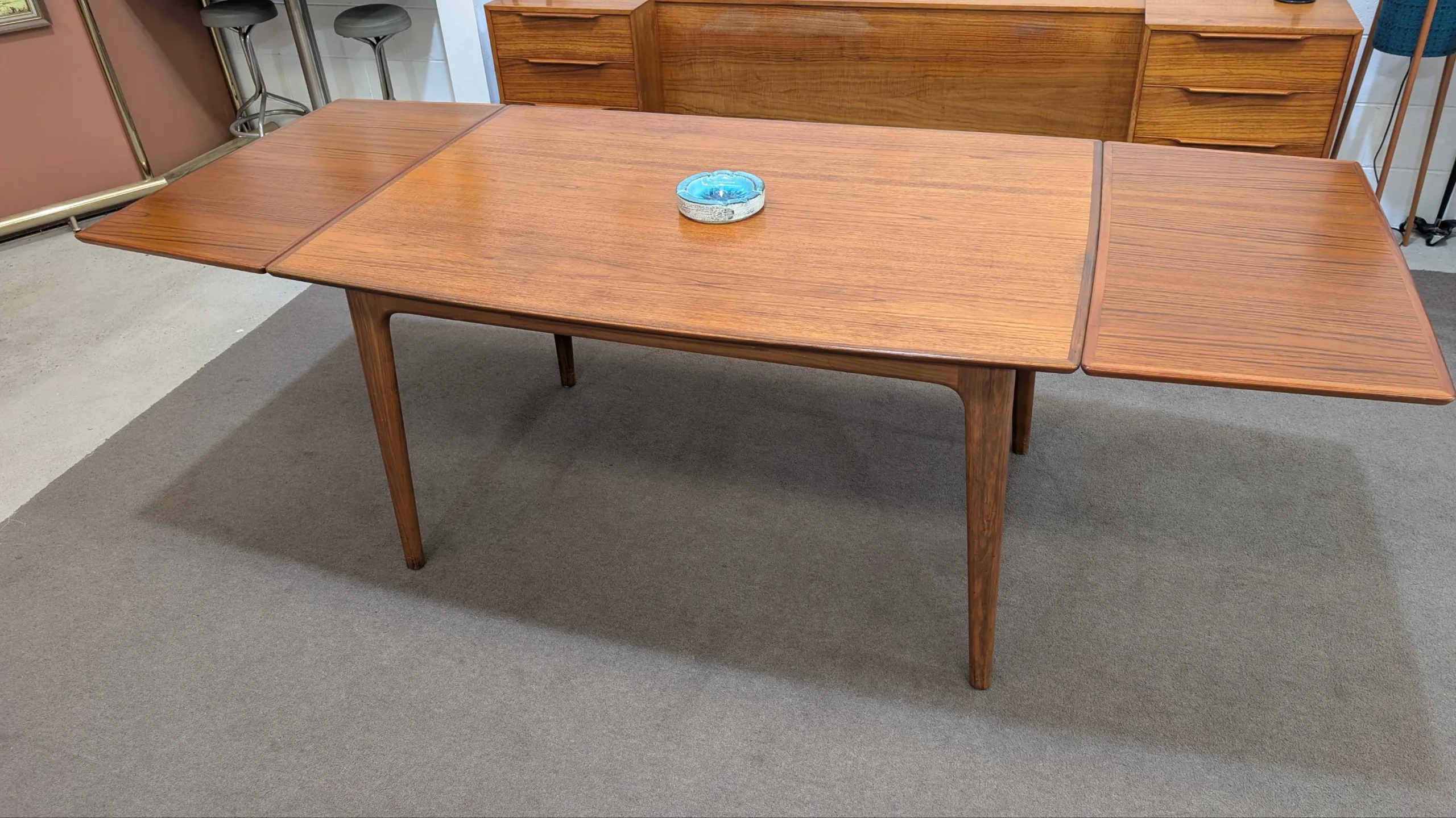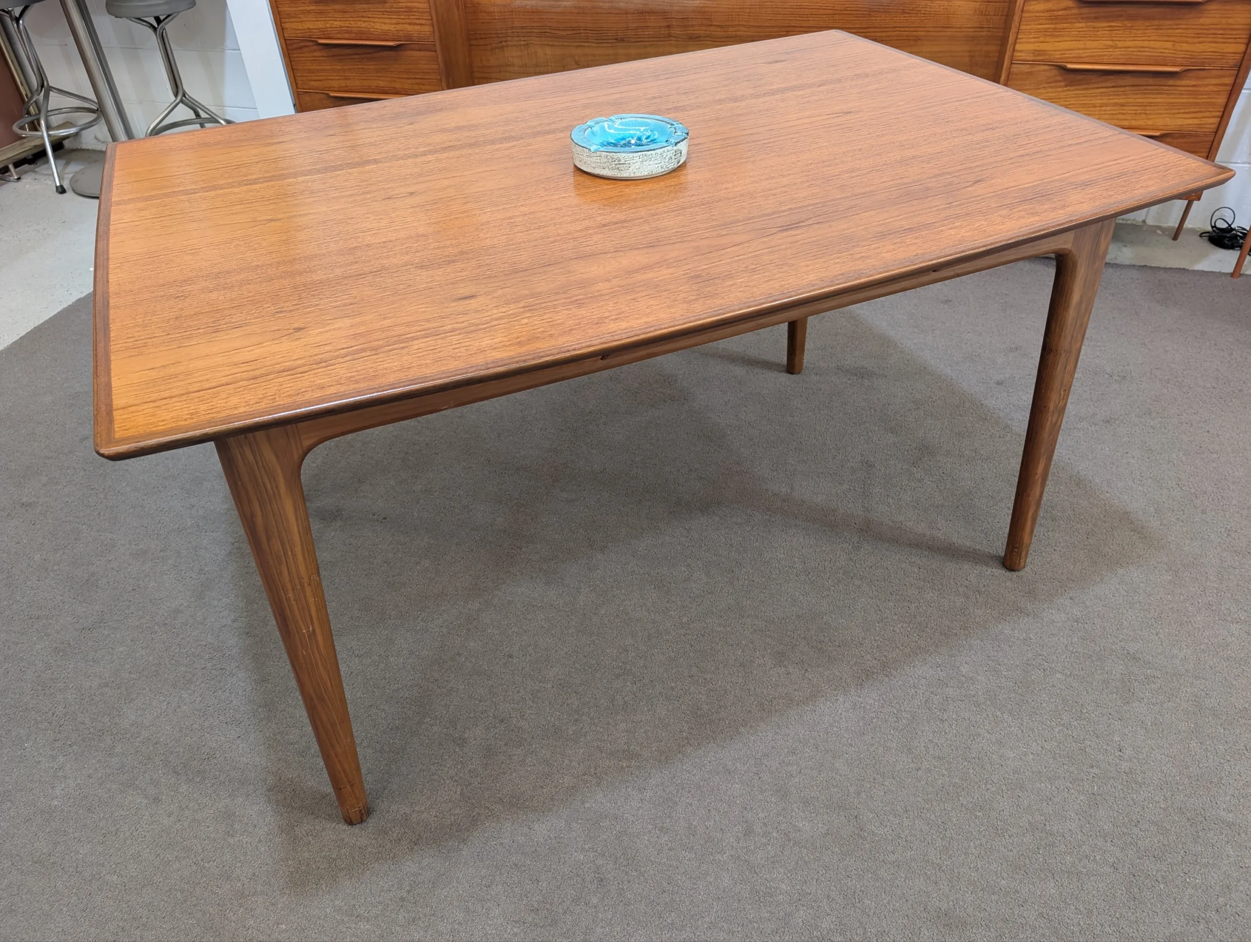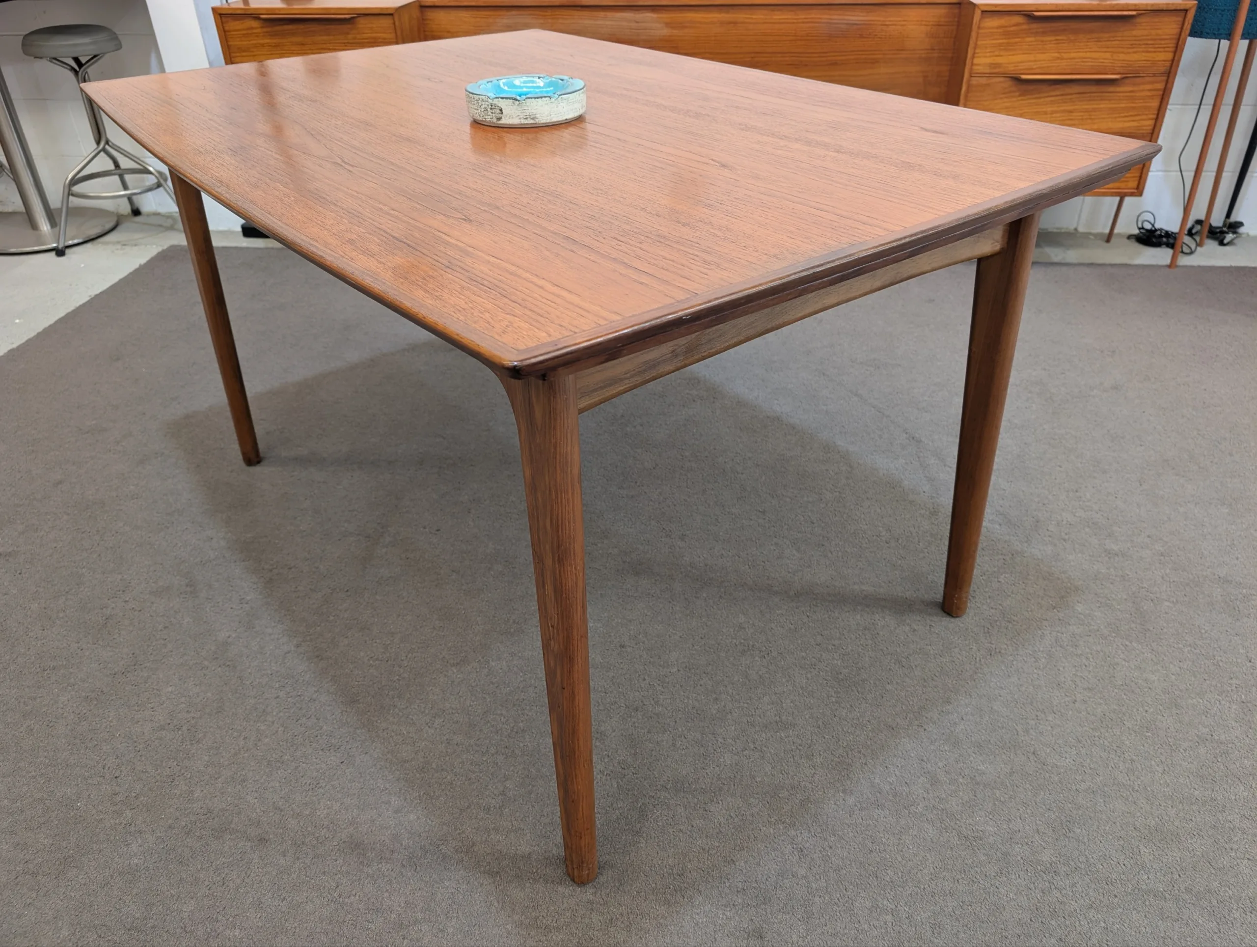 Retro extendable dining table by Noblett in good solid condition. Sturdy well made unit. Extension system works easily. High attention to detail. Retains makers stamp. Chairs as pictured available in separate listing. Overall presents well.