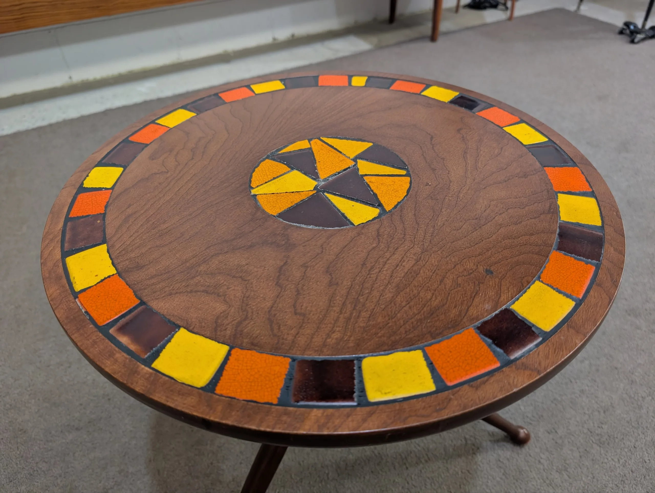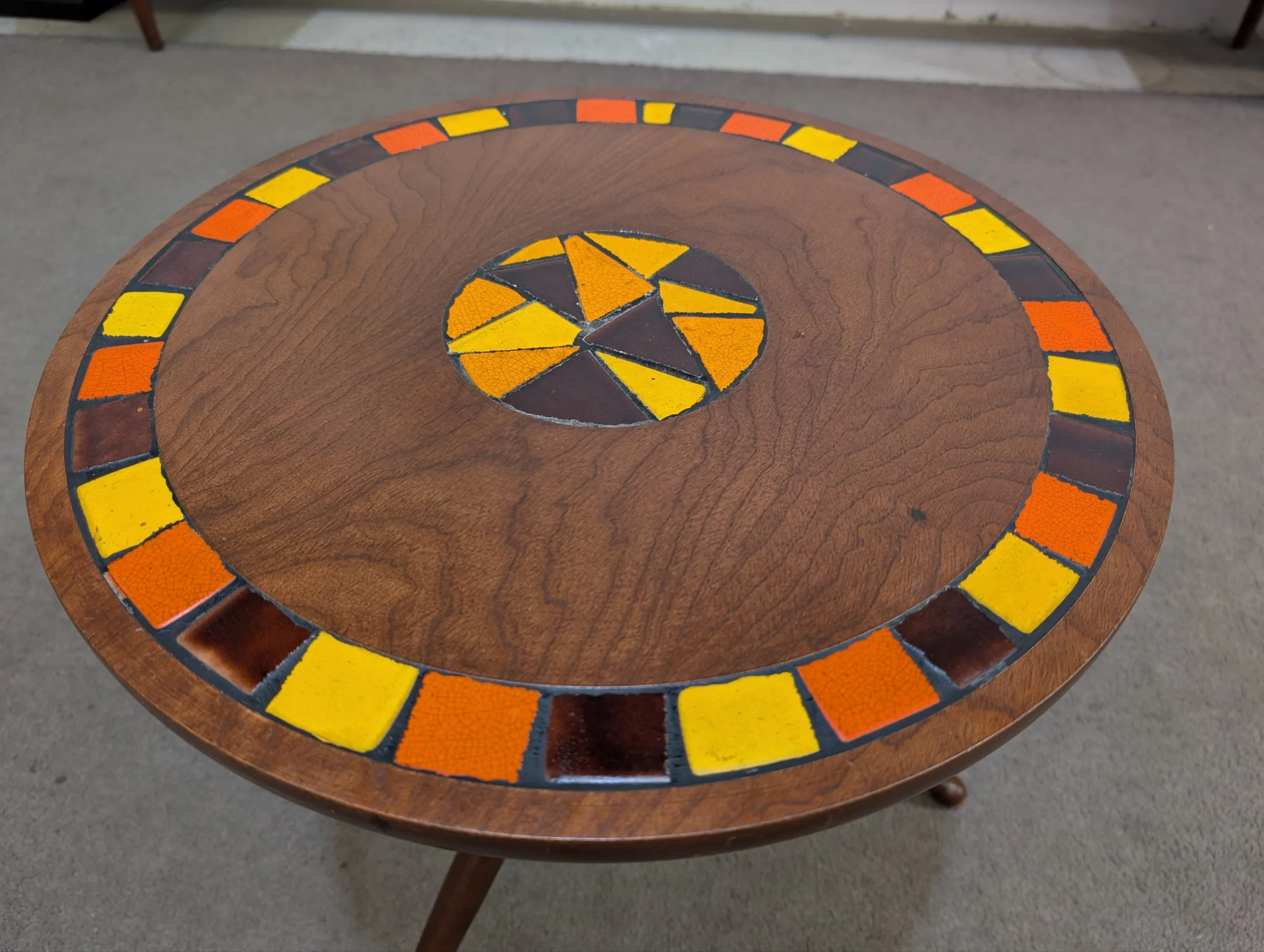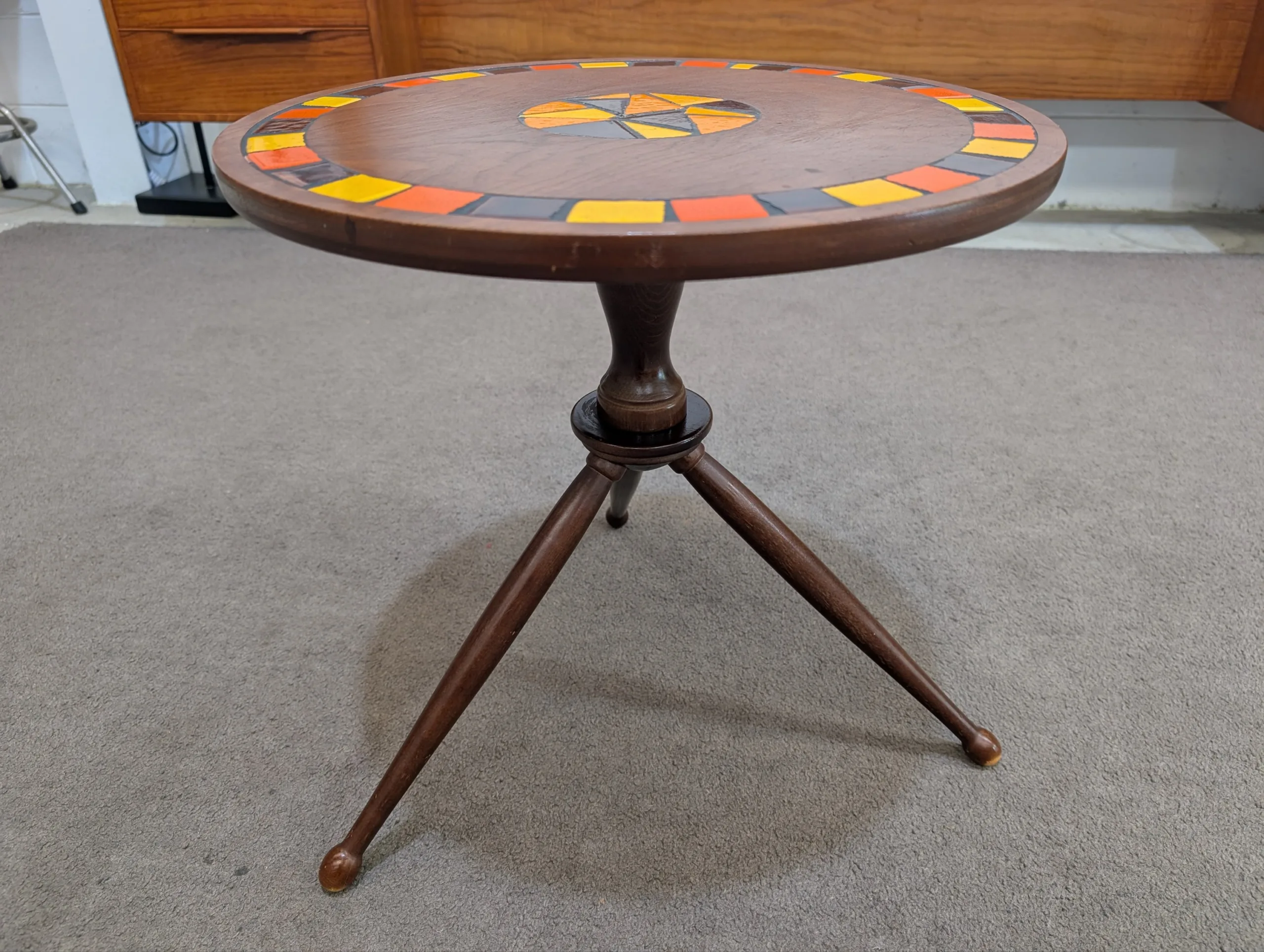 Retro lamp side table in excellent condition. Sturdy well made unit. Attractive tri leg atomic design. Interesting tile motif. Great retro aesthetic. Presents well.