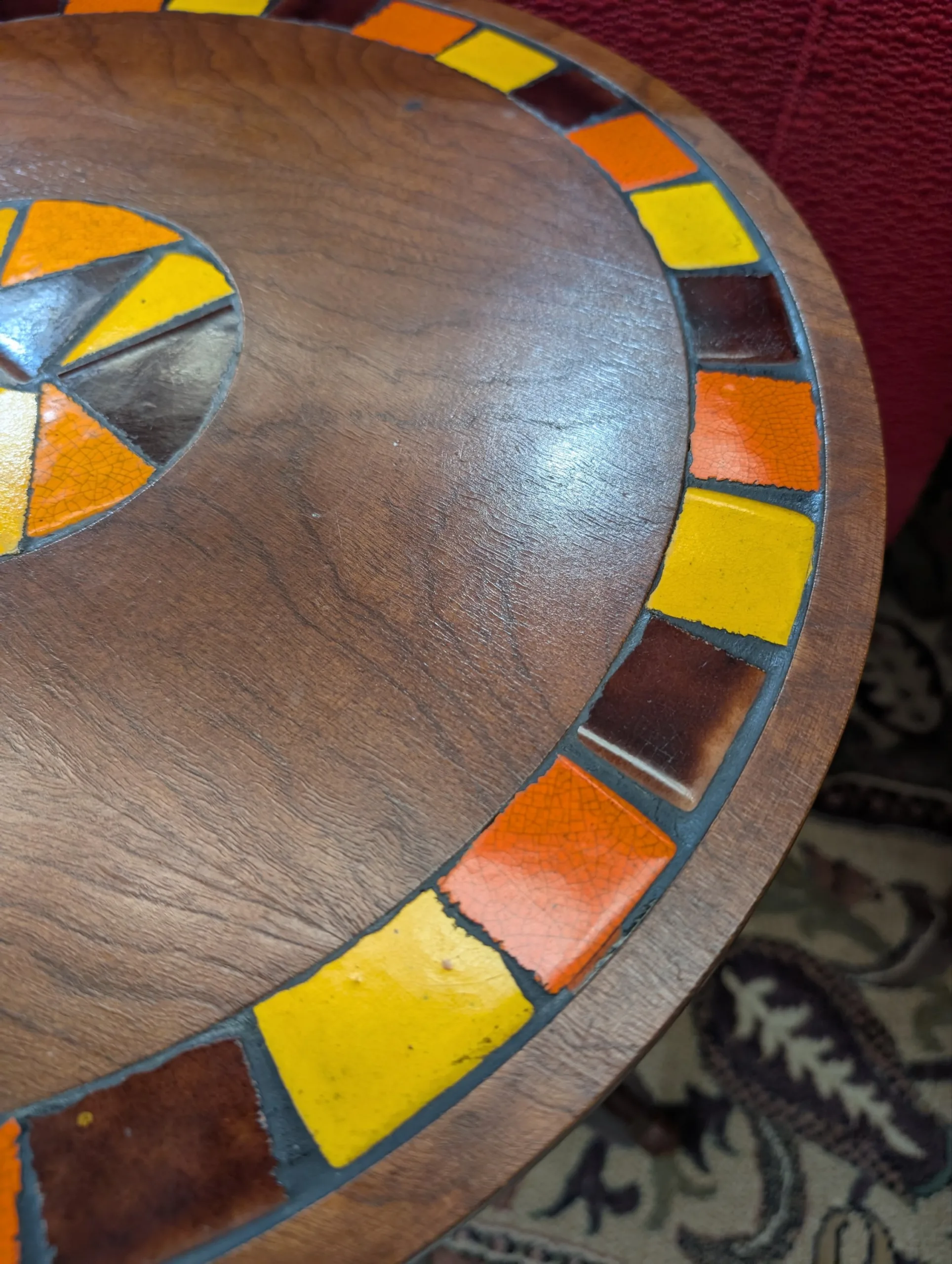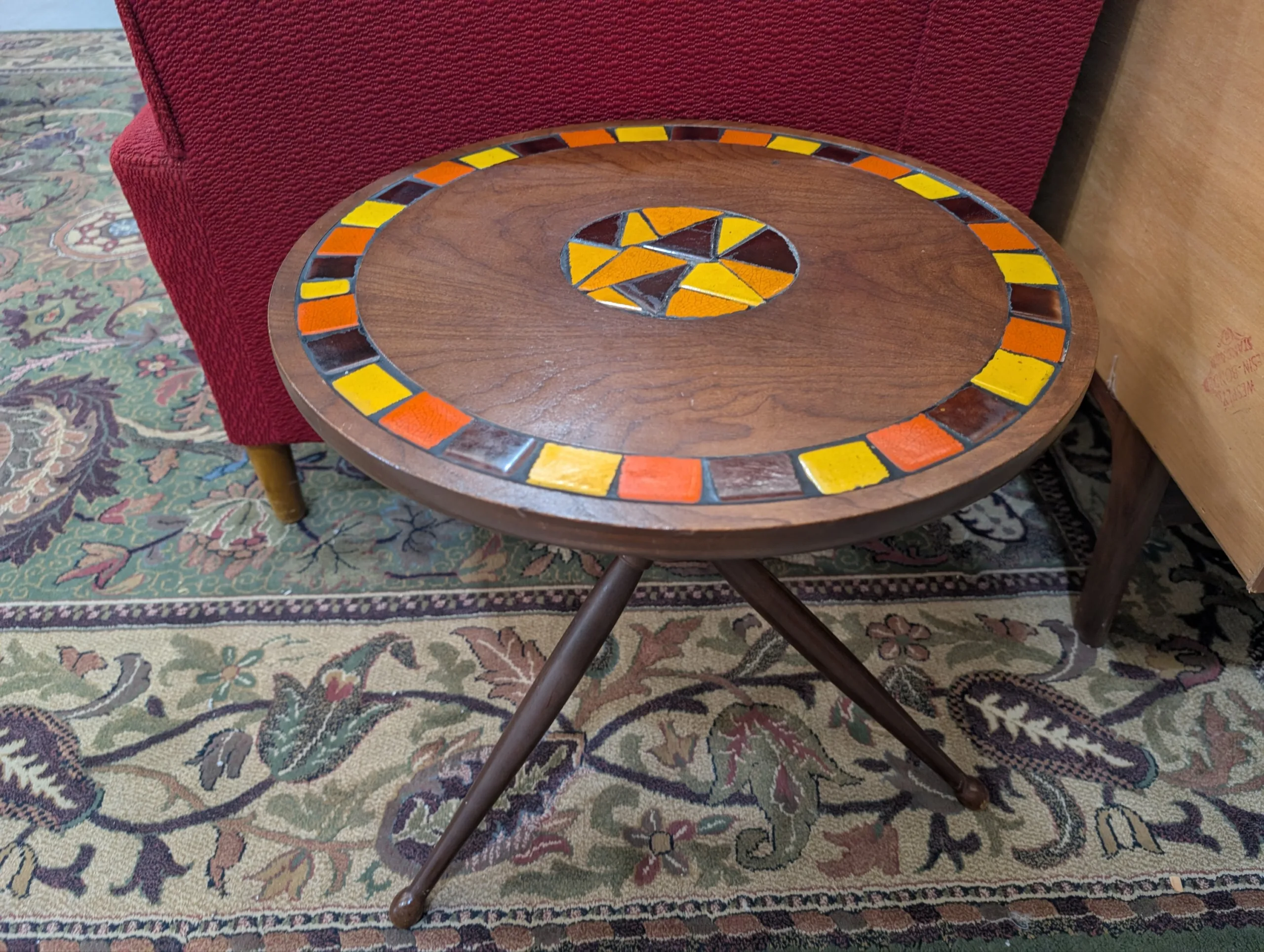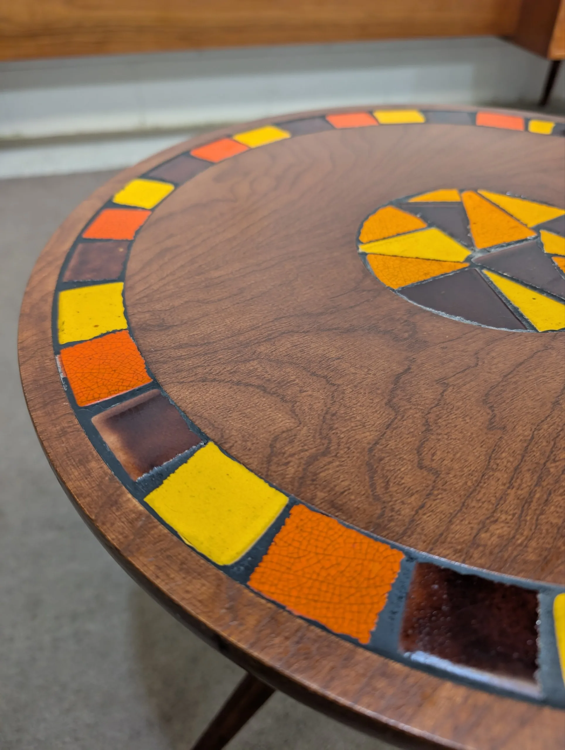 Retro lamp side table in excellent condition. Sturdy well made unit. Attractive tri leg atomic design. Interesting tile motif. Great retro aesthetic. Presents well.
