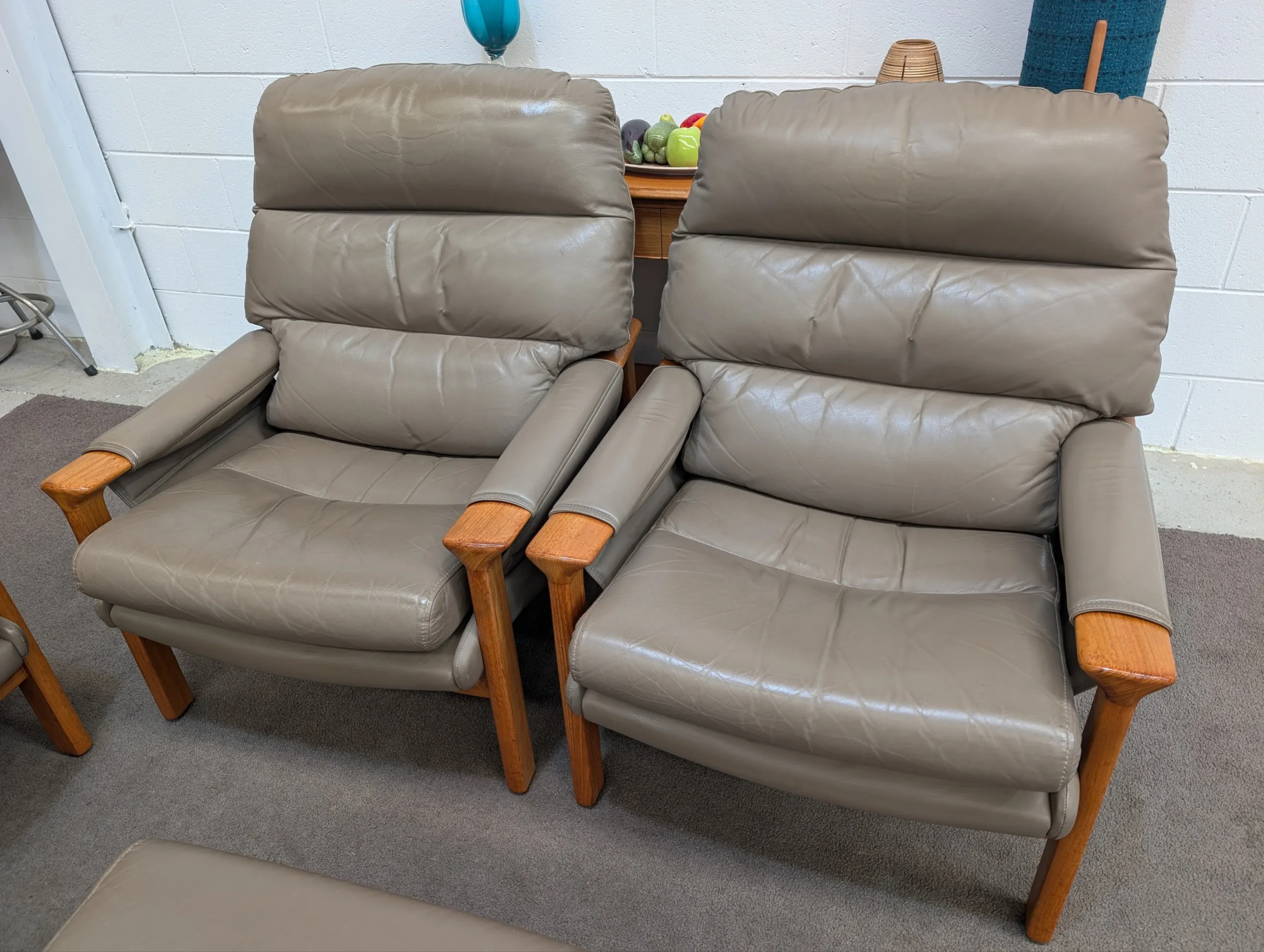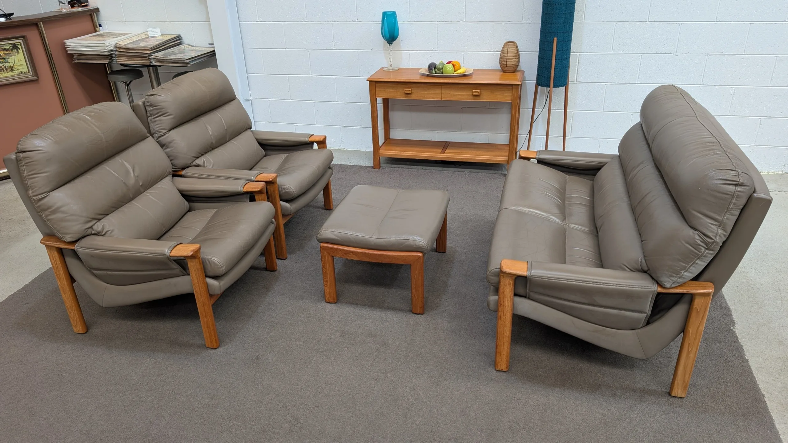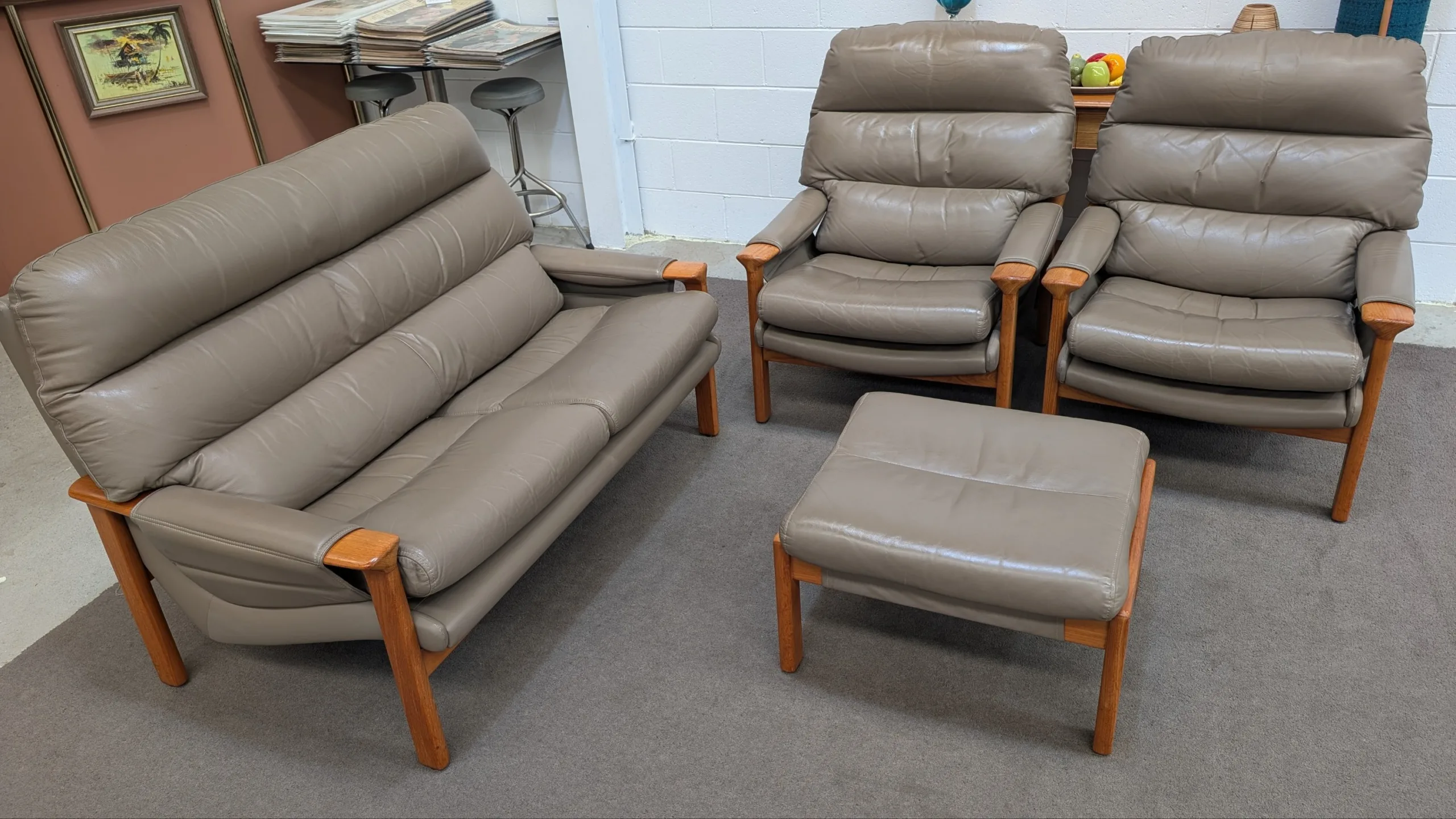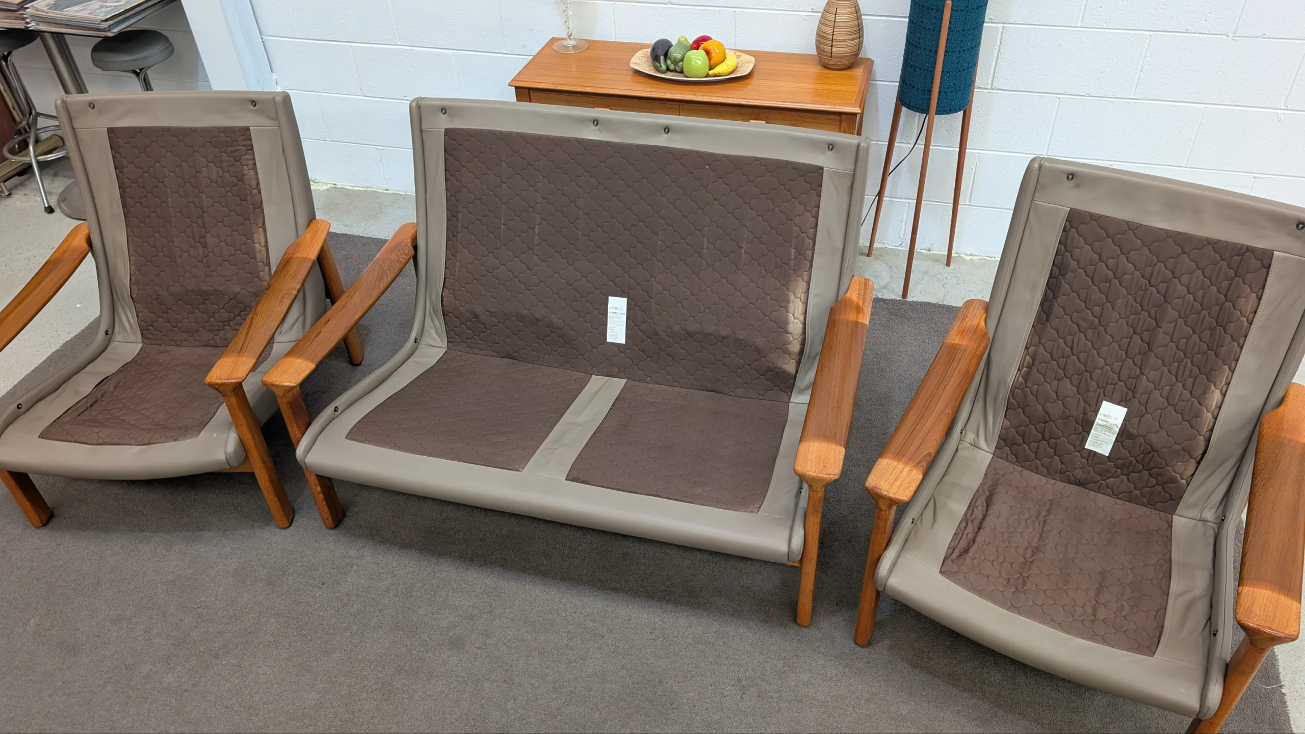 Retro leather Tessa Executive lounge suite in good solid condition. Original with maker's tags. Nice colour scheme, popular model with hard to find matching ottoman. Armchair seating a little soft, could need additional strapping down the track. Genuine vintage item, not perfect. Fabric steam cleaned and leather conditioned. All four pieces included in the listing.