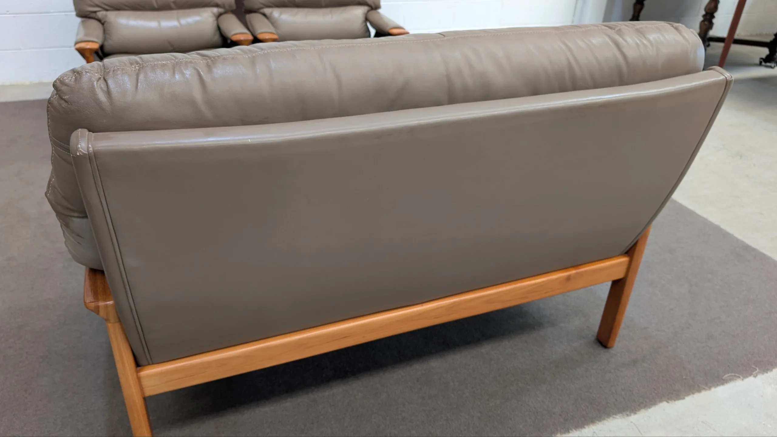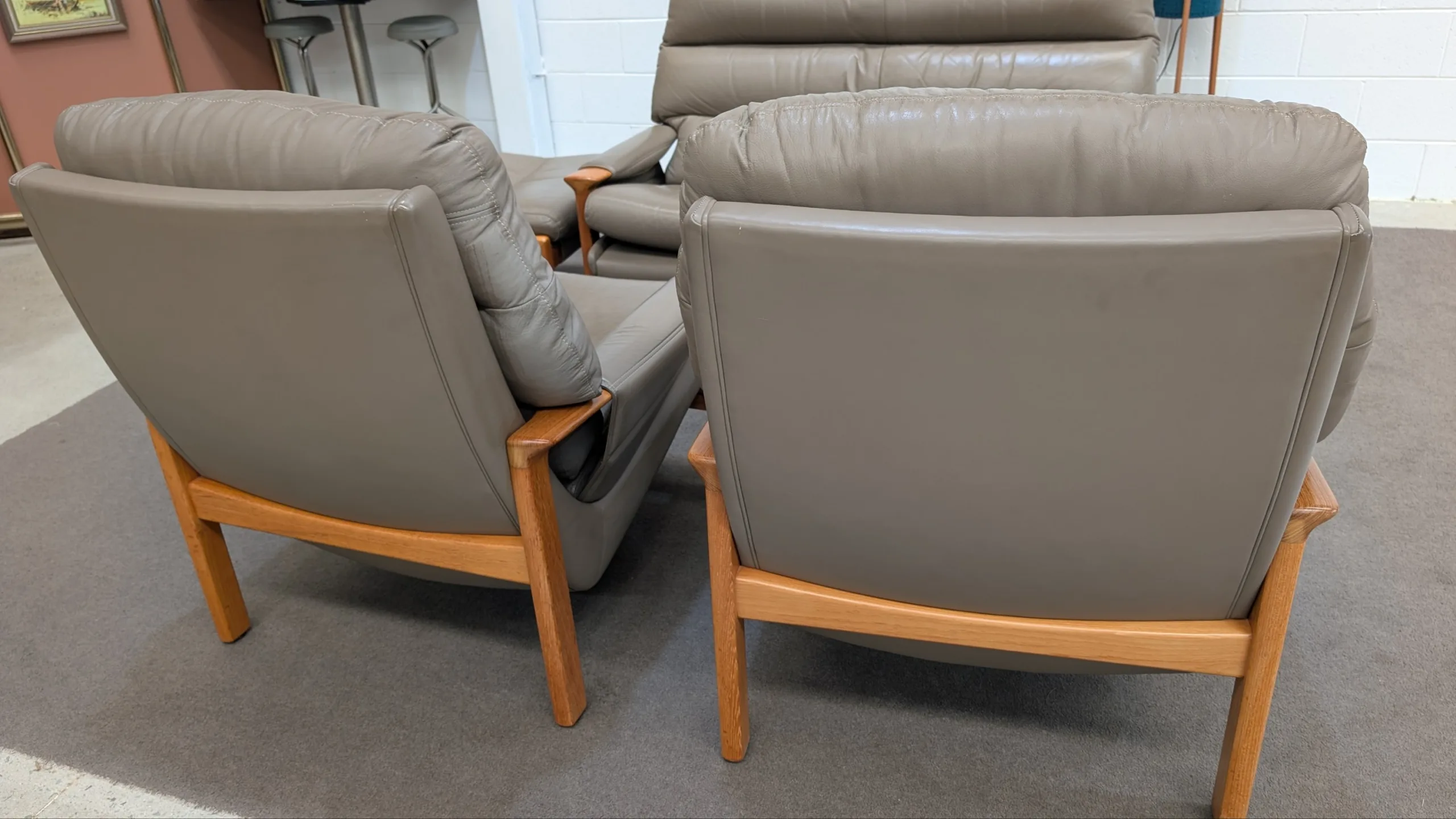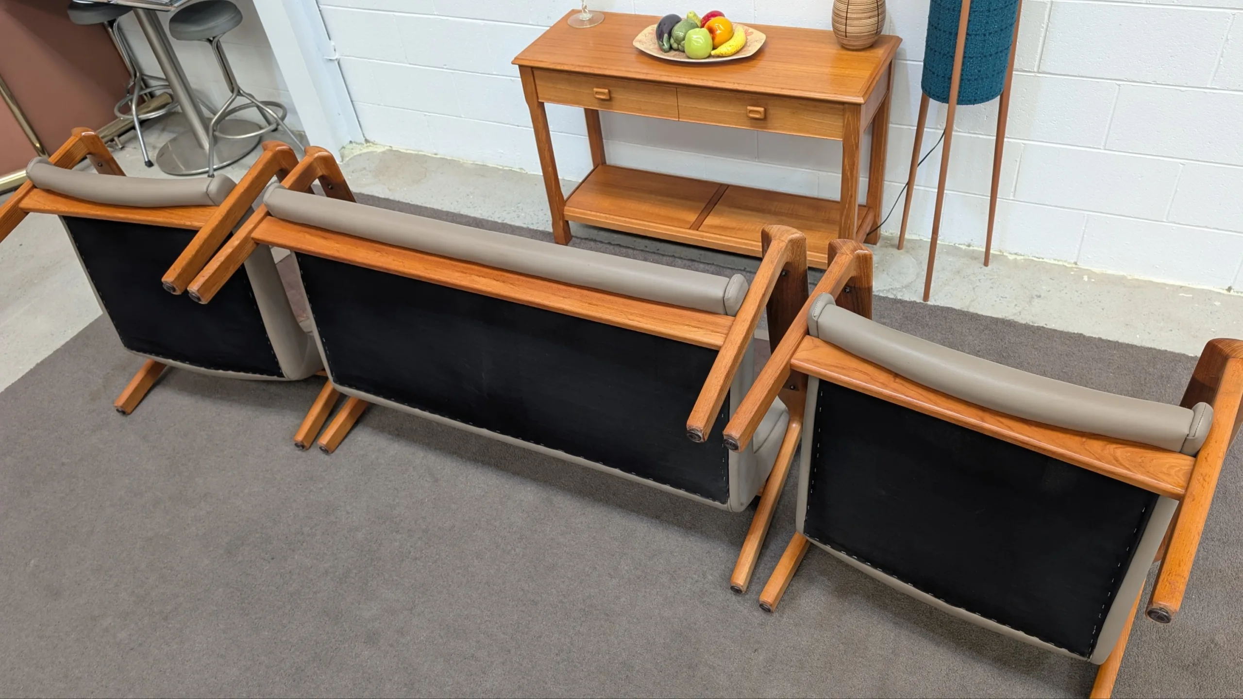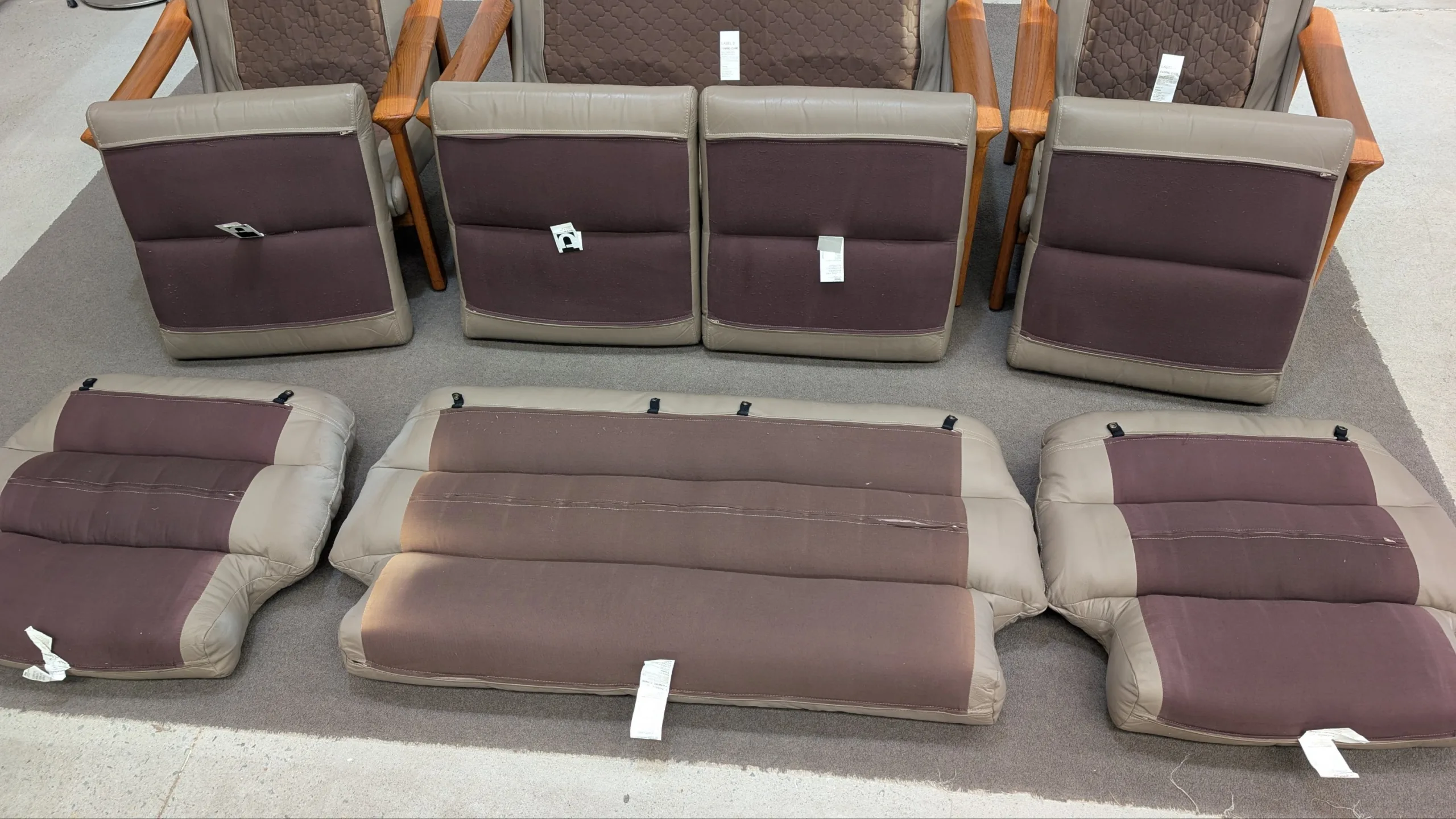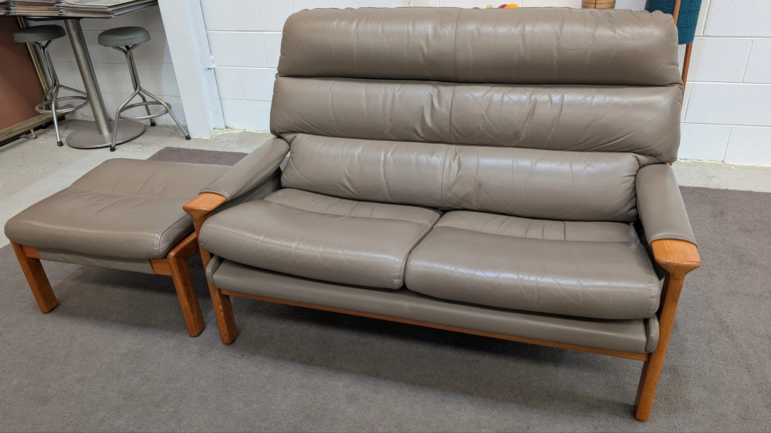 Retro leather Tessa Executive lounge suite in good solid condition. Original with maker's tags. Nice colour scheme, popular model with hard to find matching ottoman. Armchair seating a little soft, could need additional strapping down the track. Genuine vintage item, not perfect. Fabric steam cleaned and leather conditioned. All four pieces included in the listing.