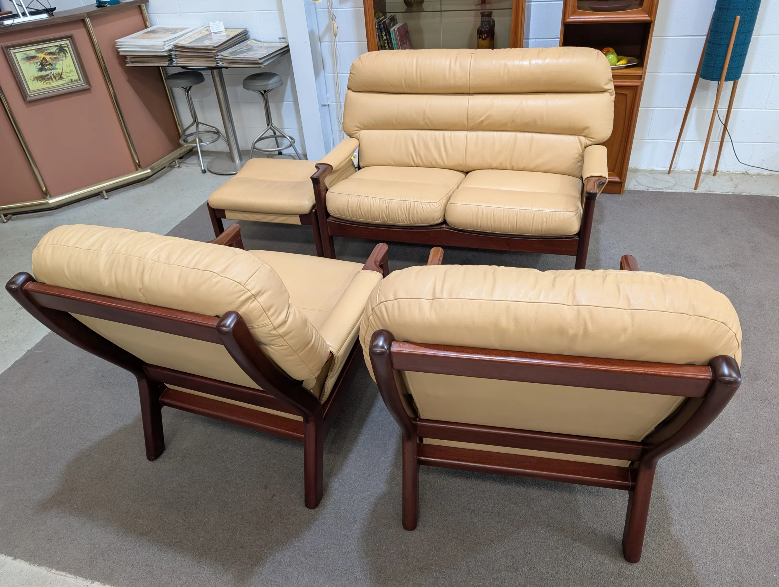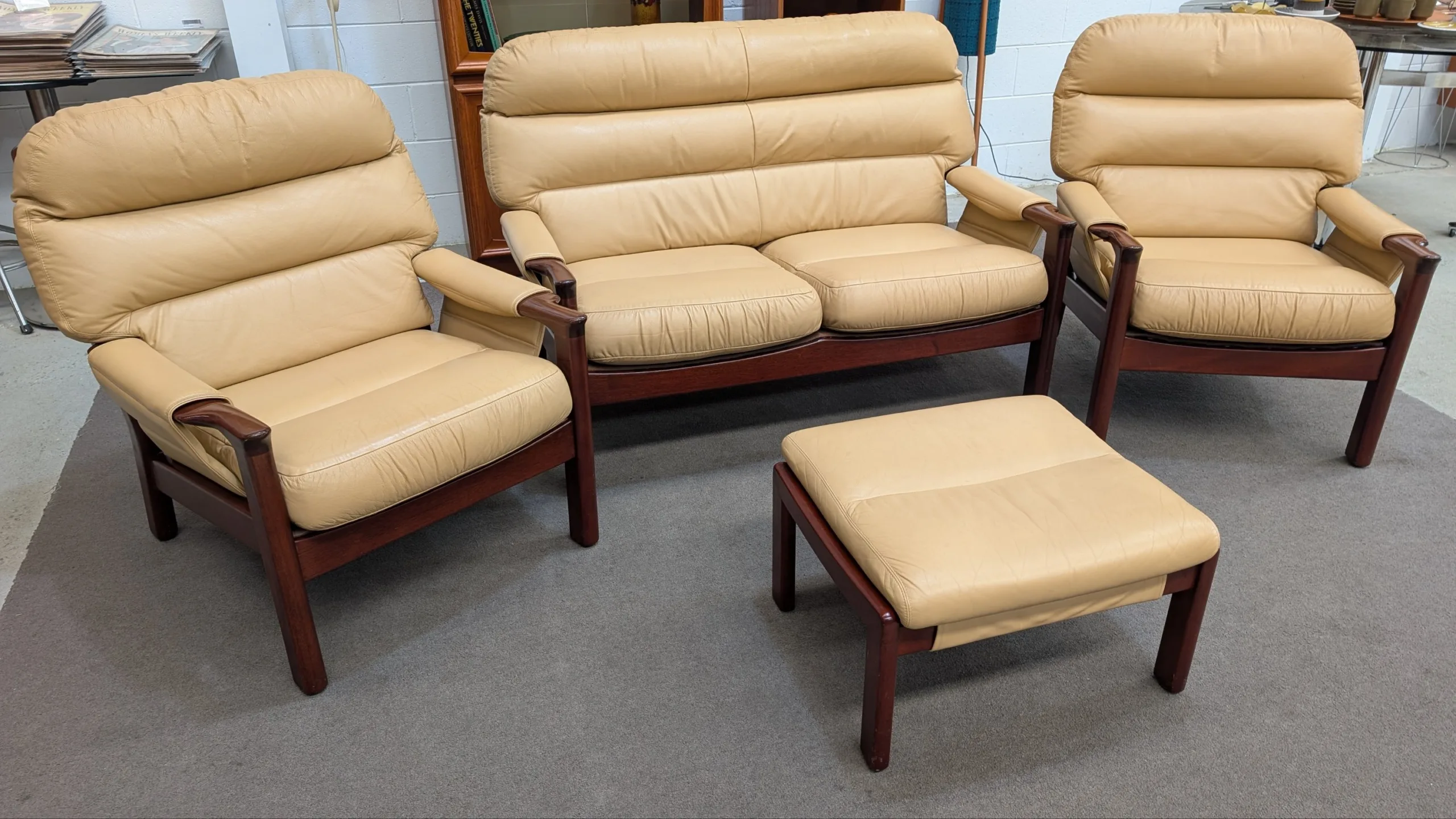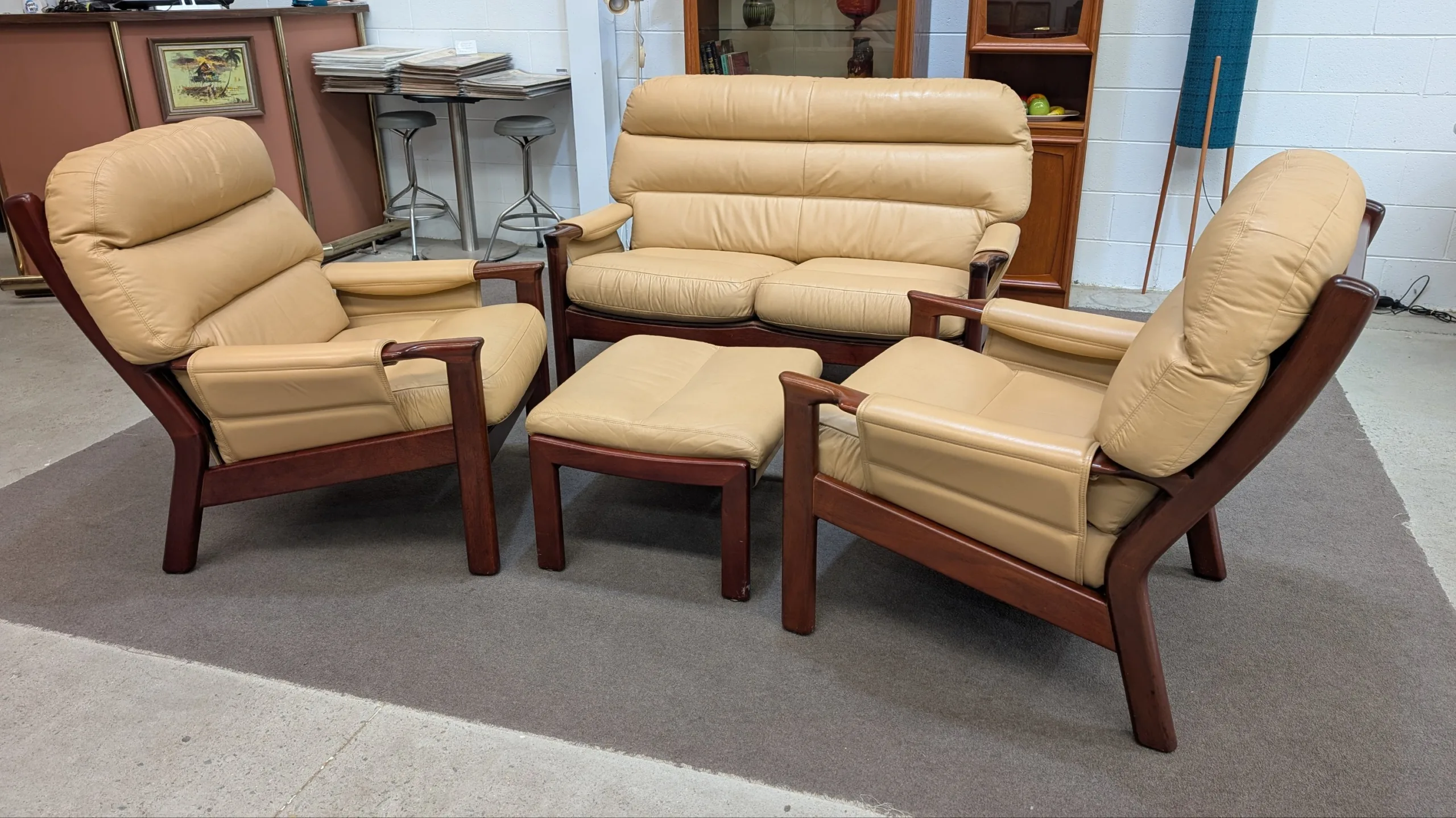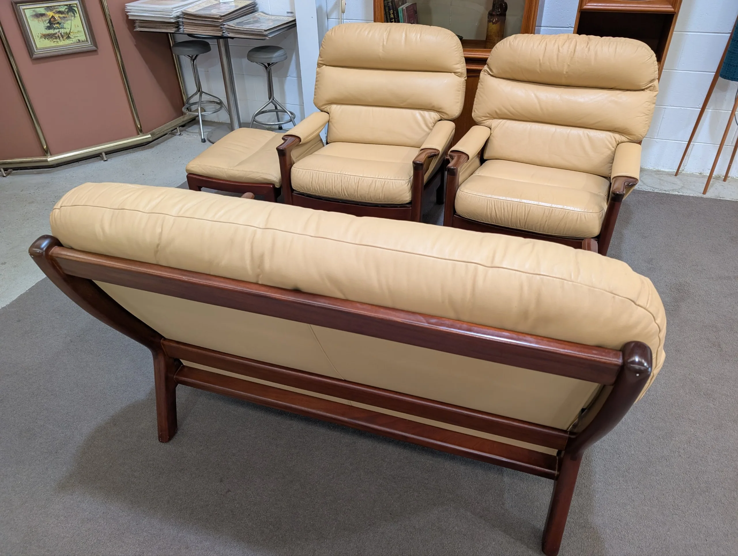 Retro TESSA Wellington lounge suite in excellent condition. Looks like an early vintage set, very hard to find in this condition. Great colour scheme. Covering in good shape, firm seating support. Solid timber frames are tight. Overall in good condition. Fabric steam cleaned and leather condioned. All four pieces included in listing.