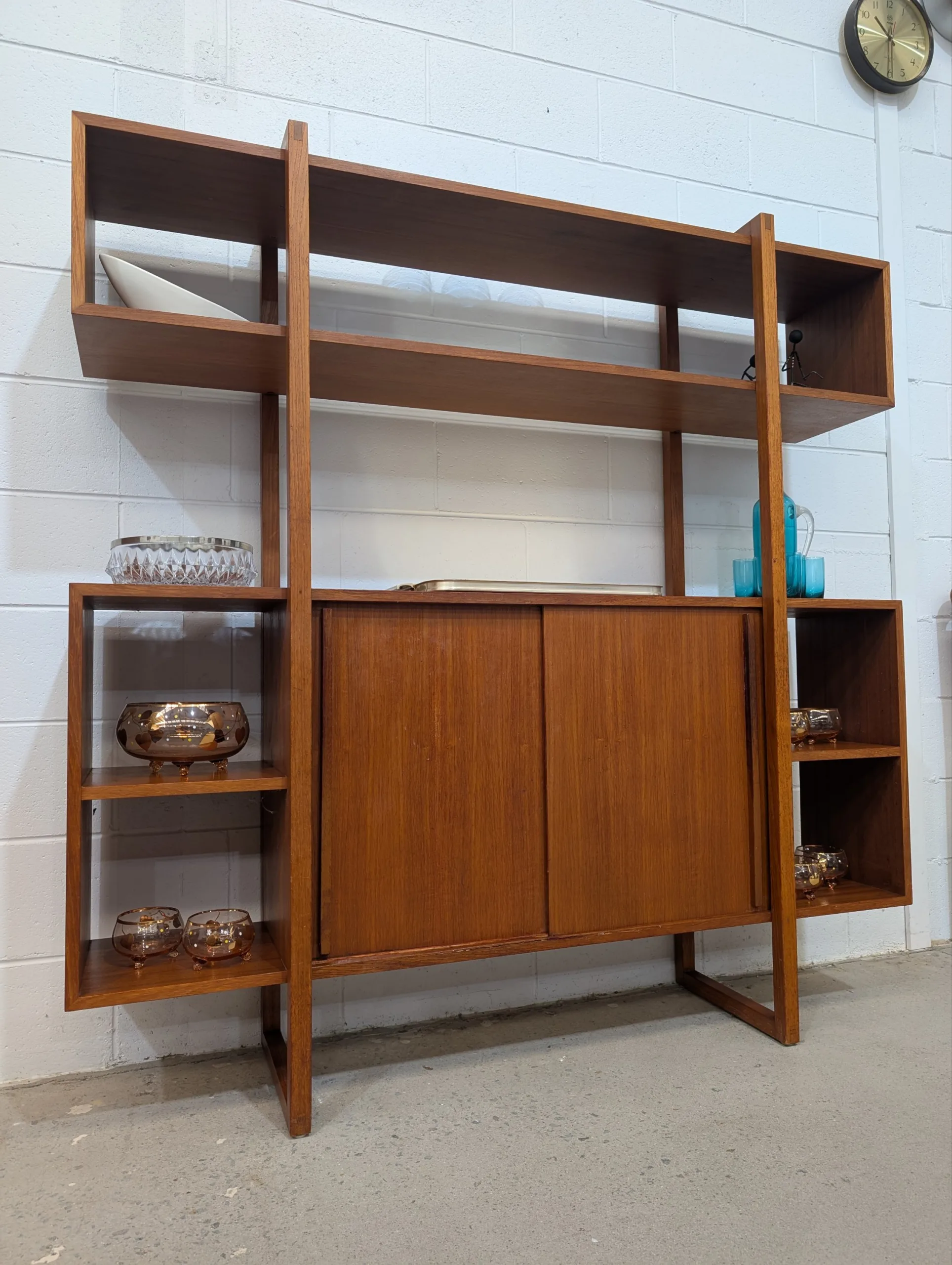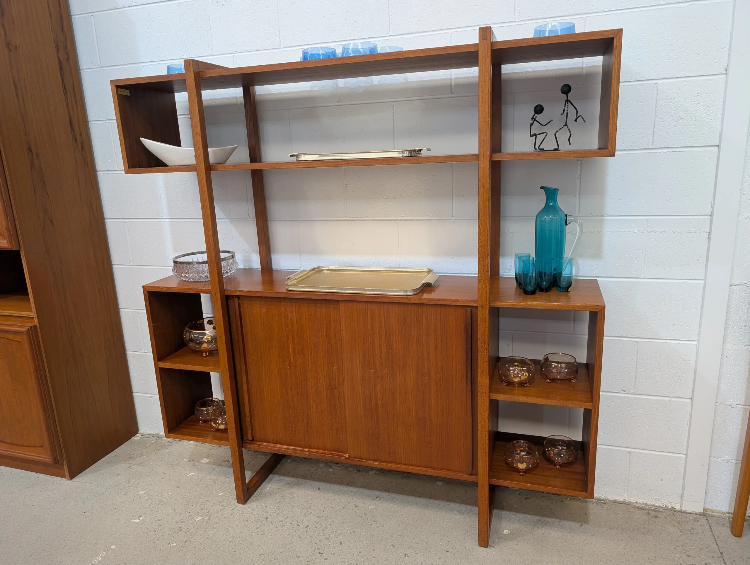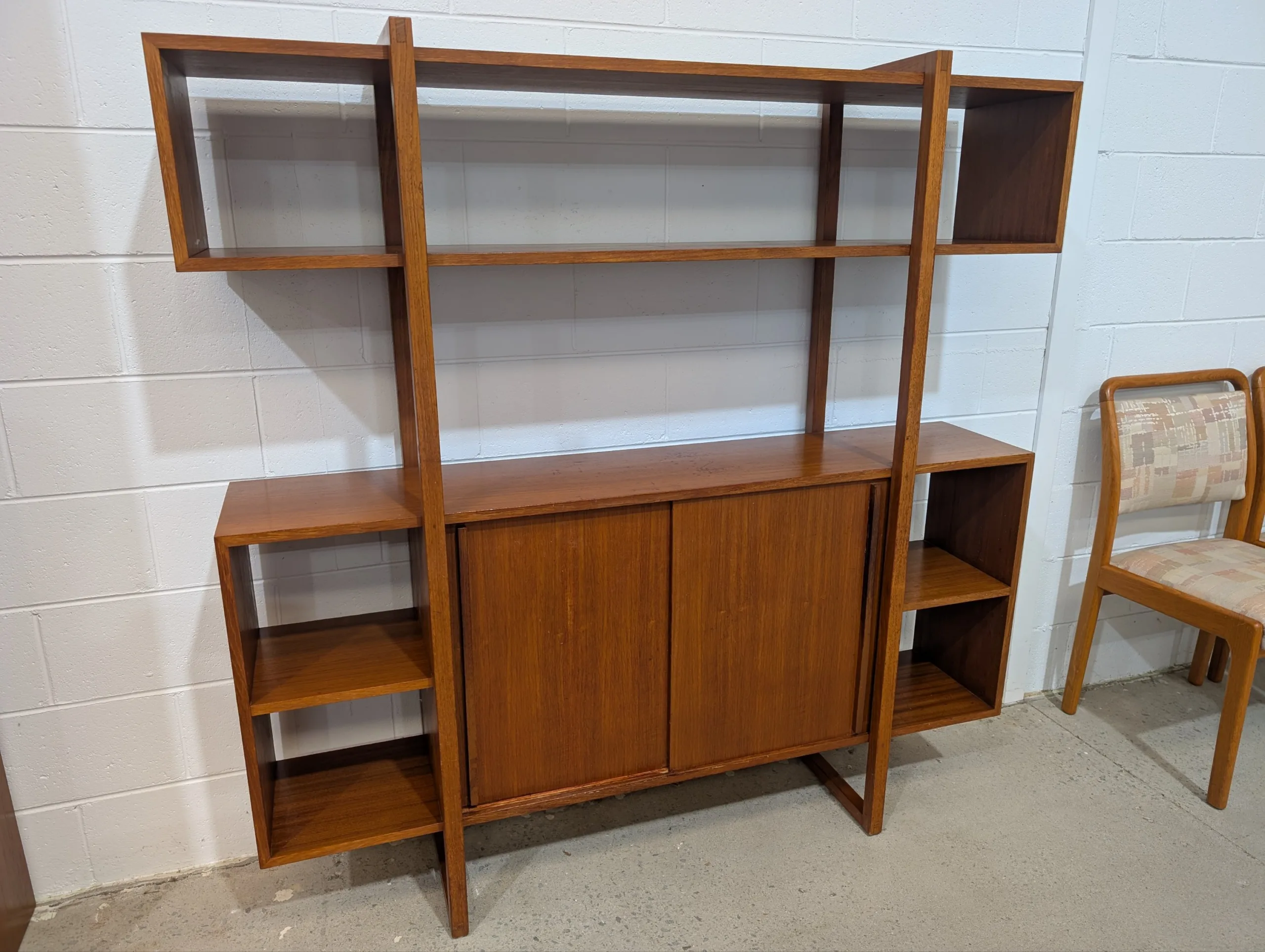 Retro Wall Unit by Rula in good solid condition. Attractive configuration. Well made with no movement. Cabinet area with sliding doors. Looks all original with maker's decal. A little rough around the edges, priced accordingly.