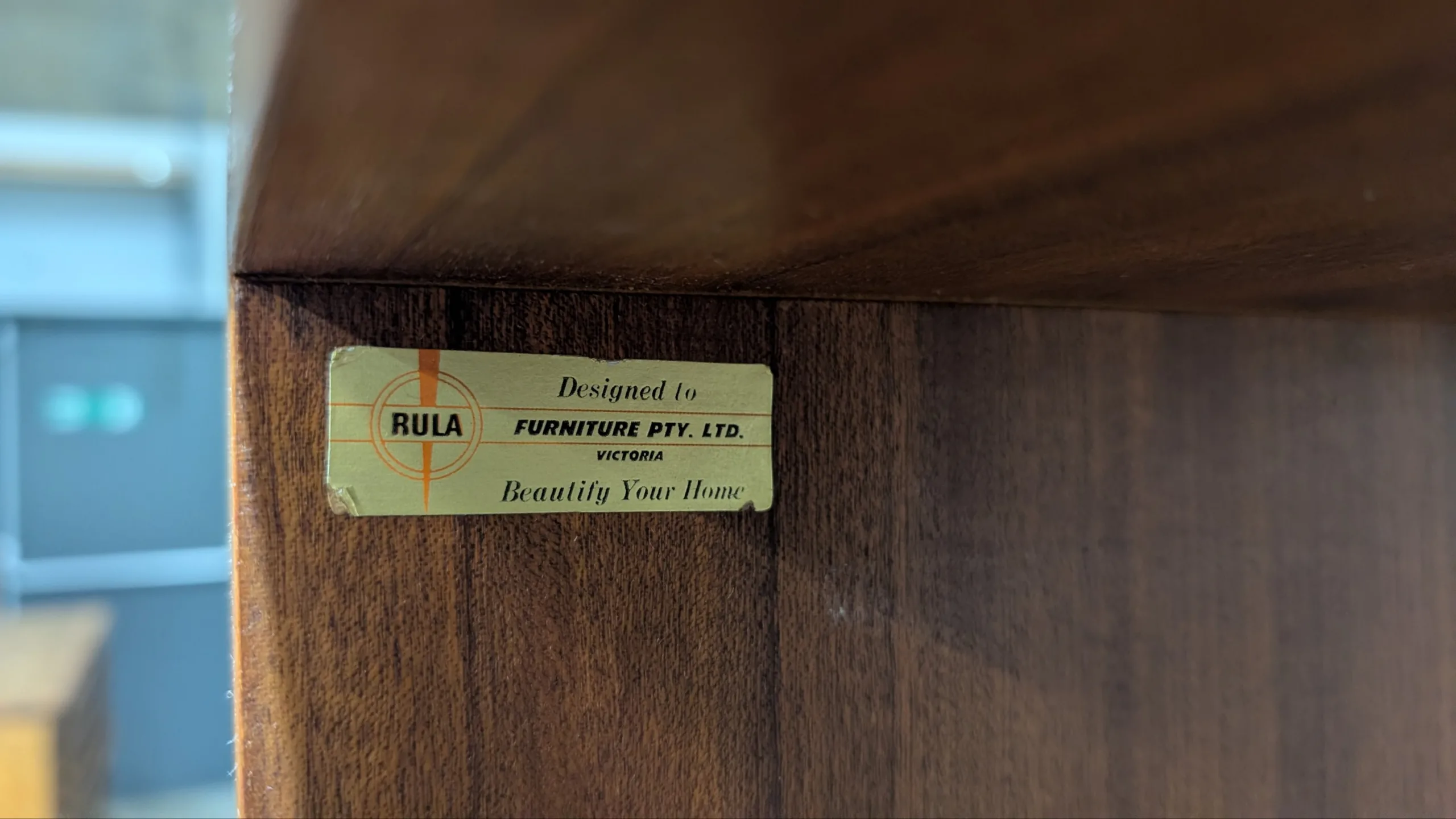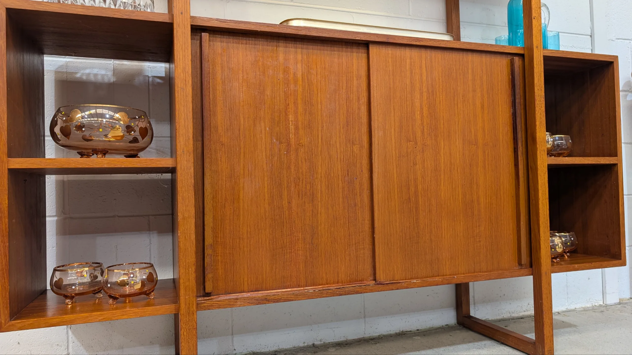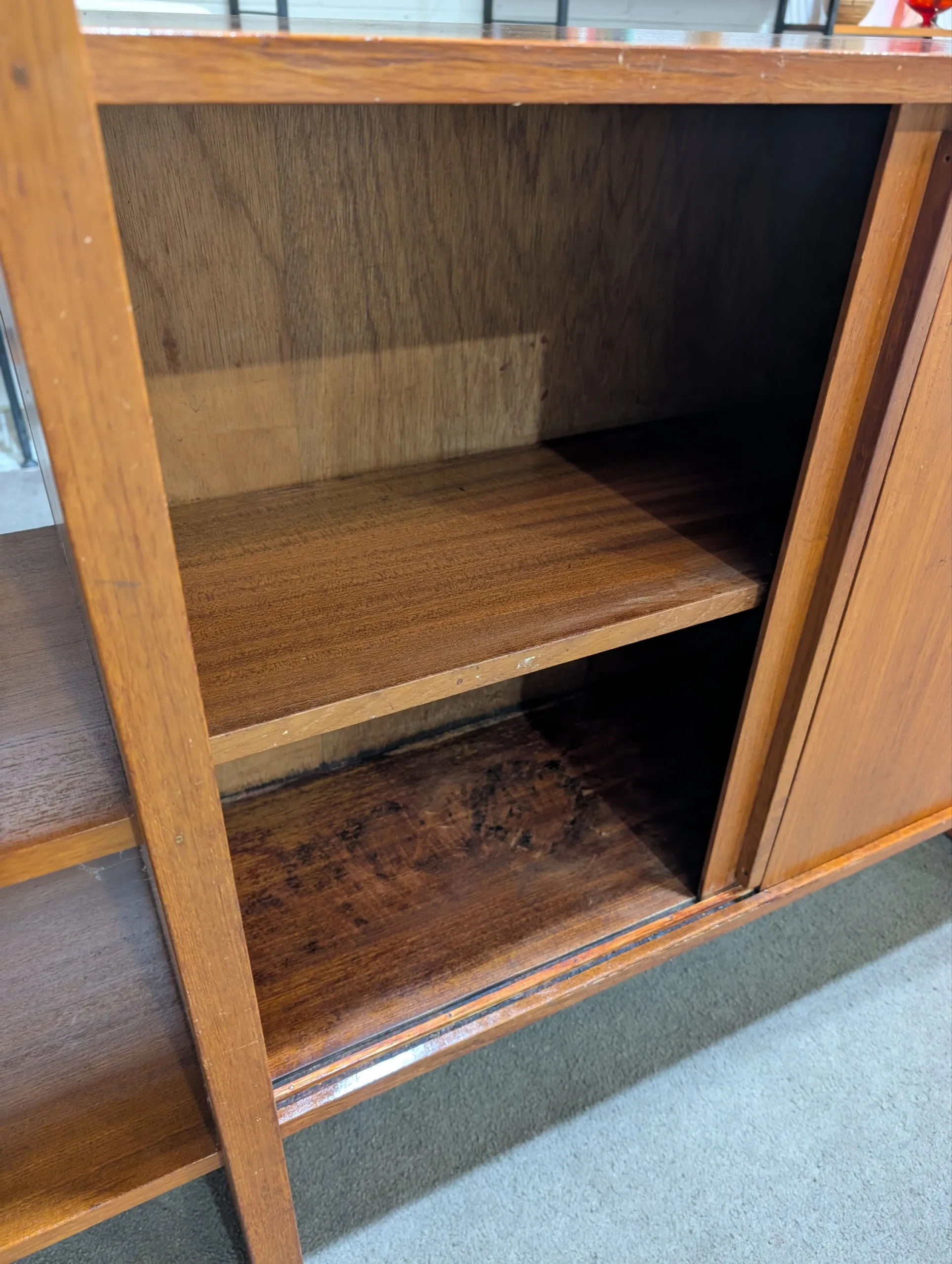 Retro Wall Unit by Rula in good solid condition. Attractive configuration. Well made with no movement. Cabinet area with sliding doors. Looks all original with maker's decal. A little rough around the edges, priced accordingly.