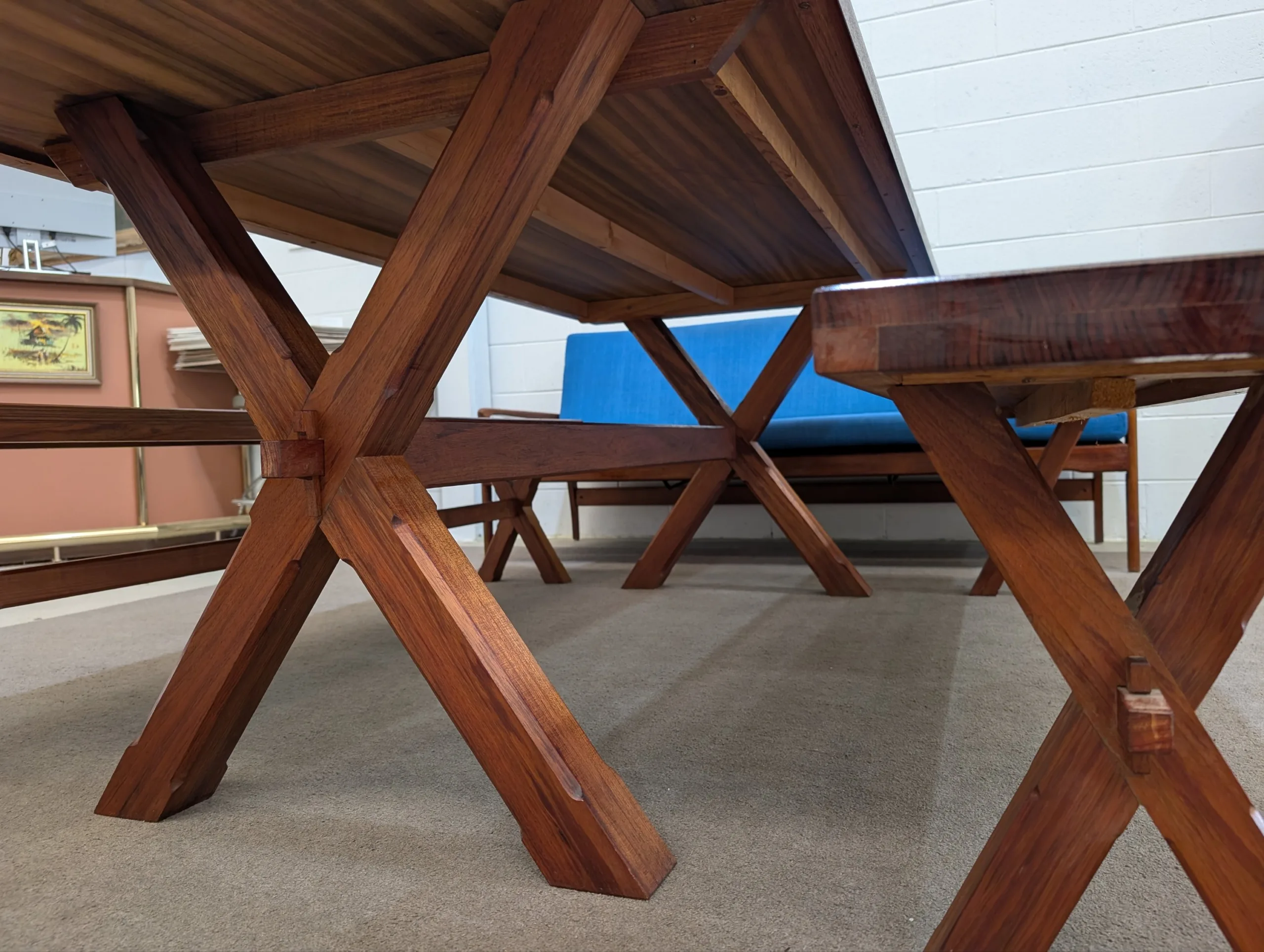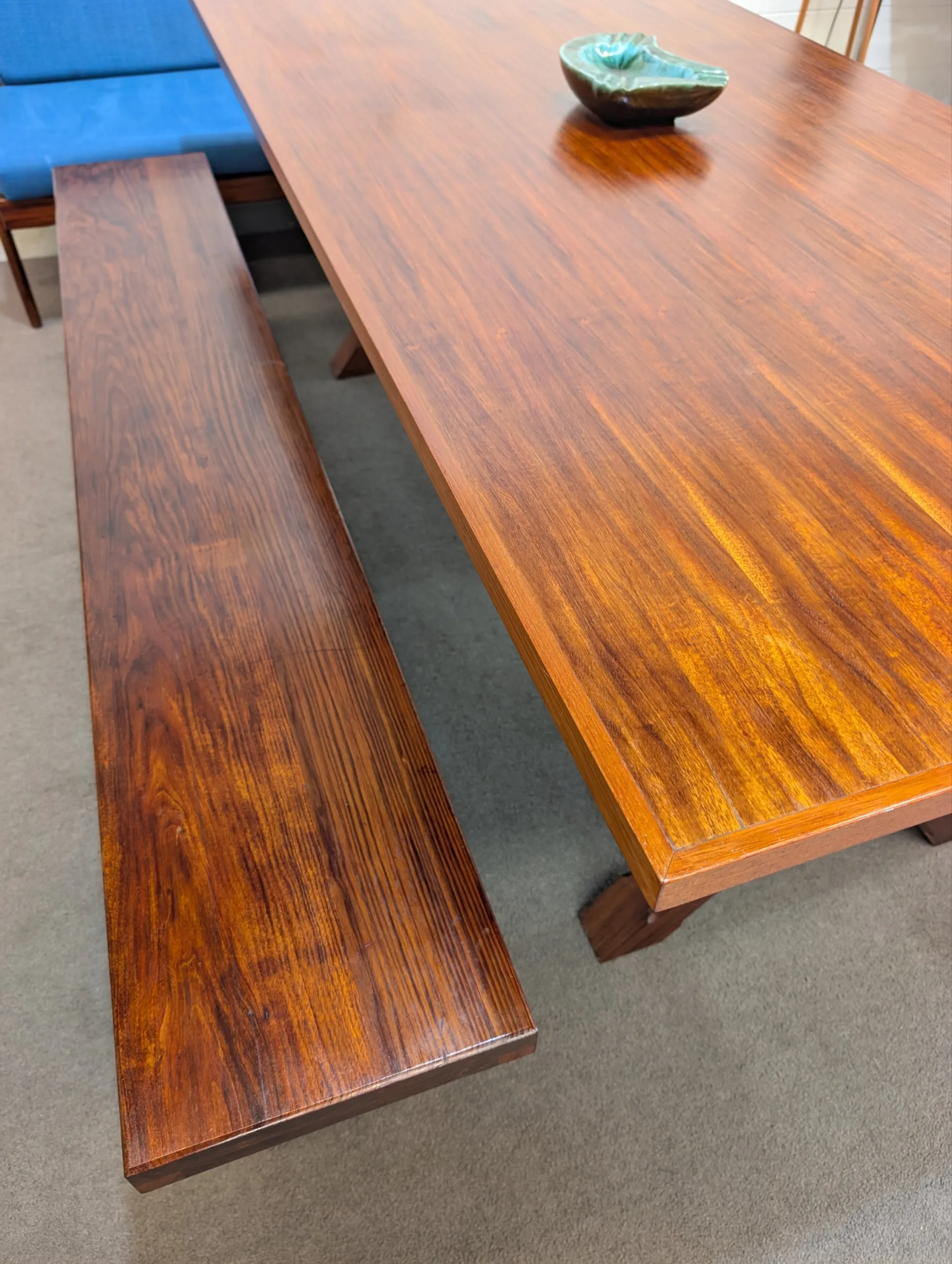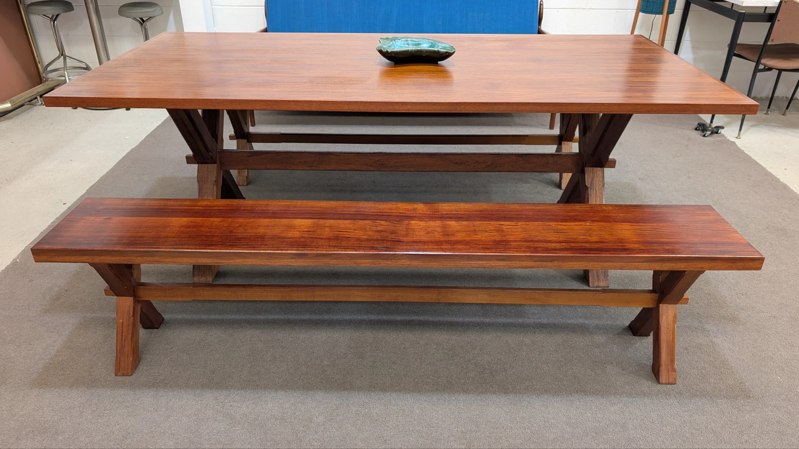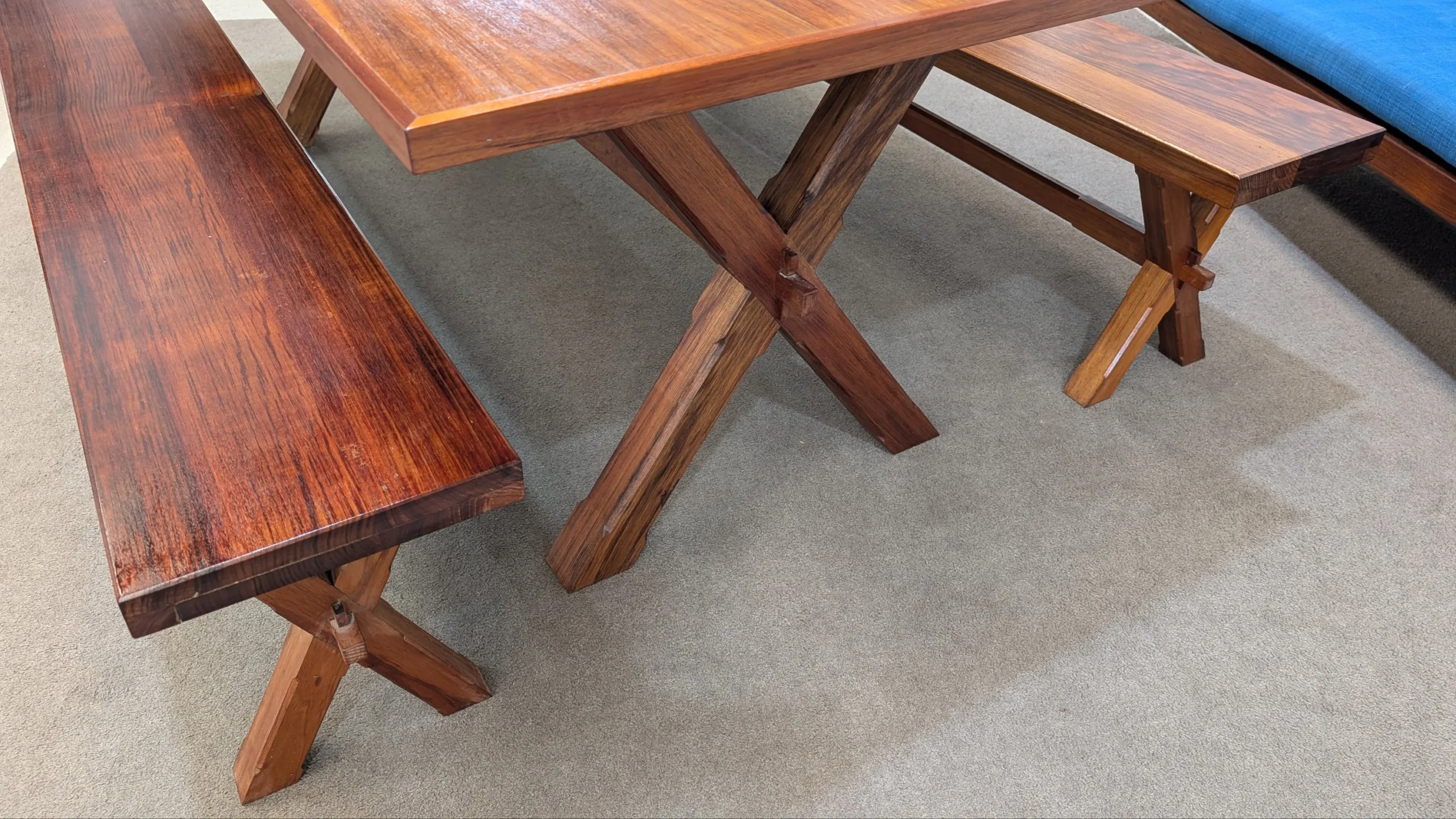 There piece timber refectory dining set in good solid condition. Well crafted using quality materials and craftsmanship. Large eight piece set. Practical design, stools tuck in neatly under table when not in use. Great visual appeal. Should compliment most spaces. Something different. All three pieces included in the listing.