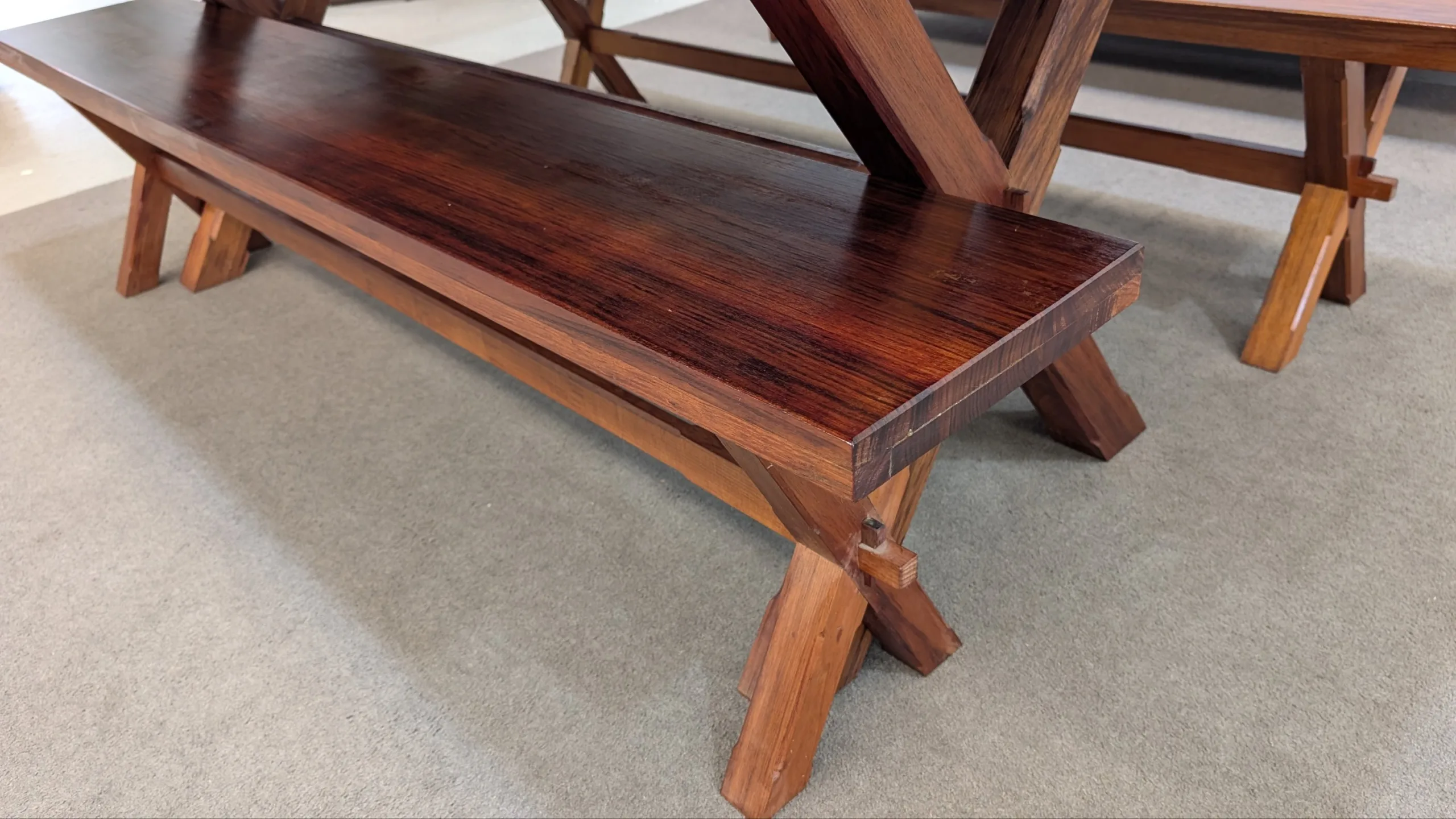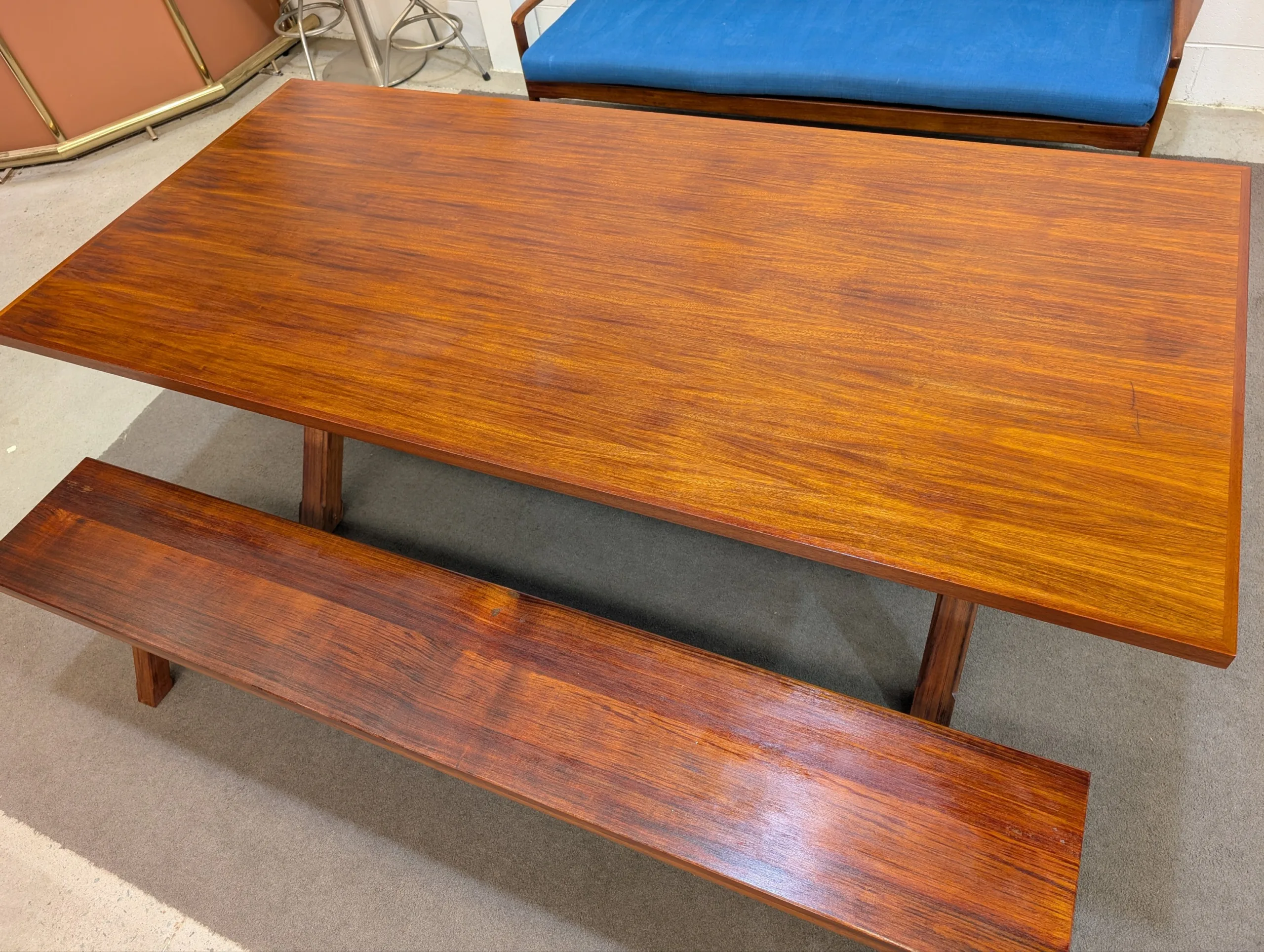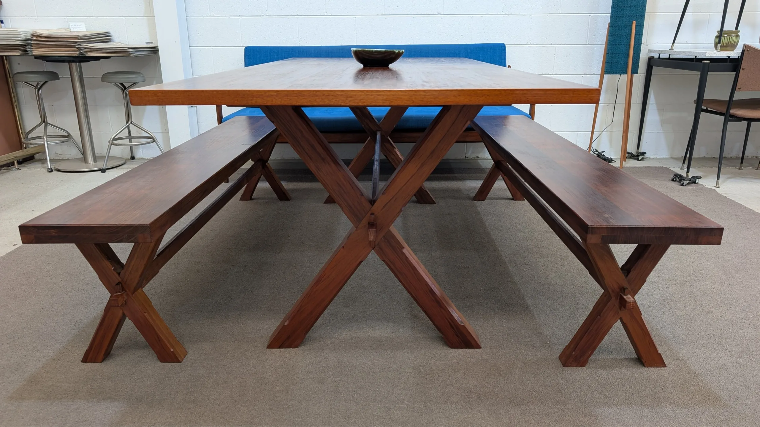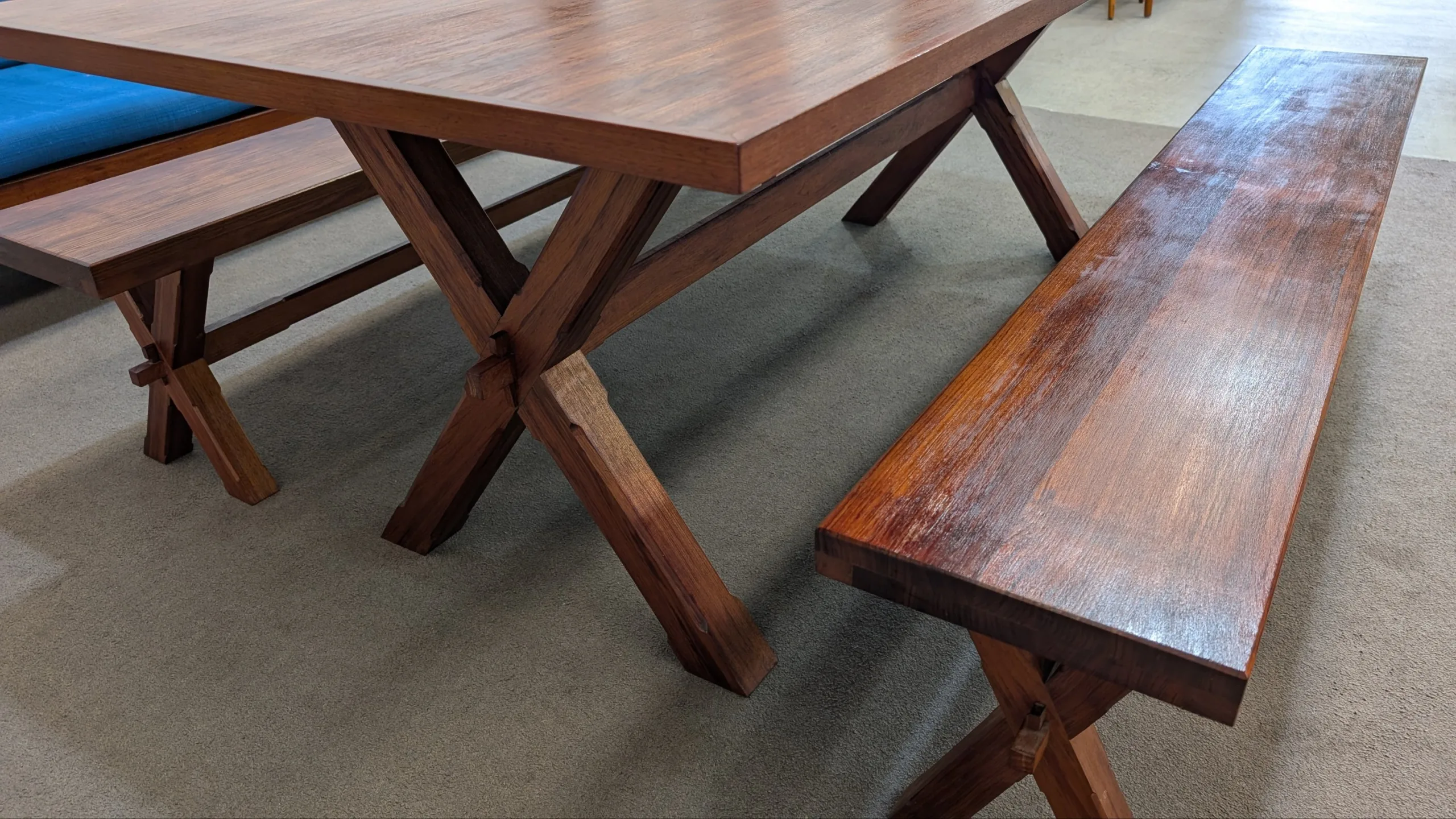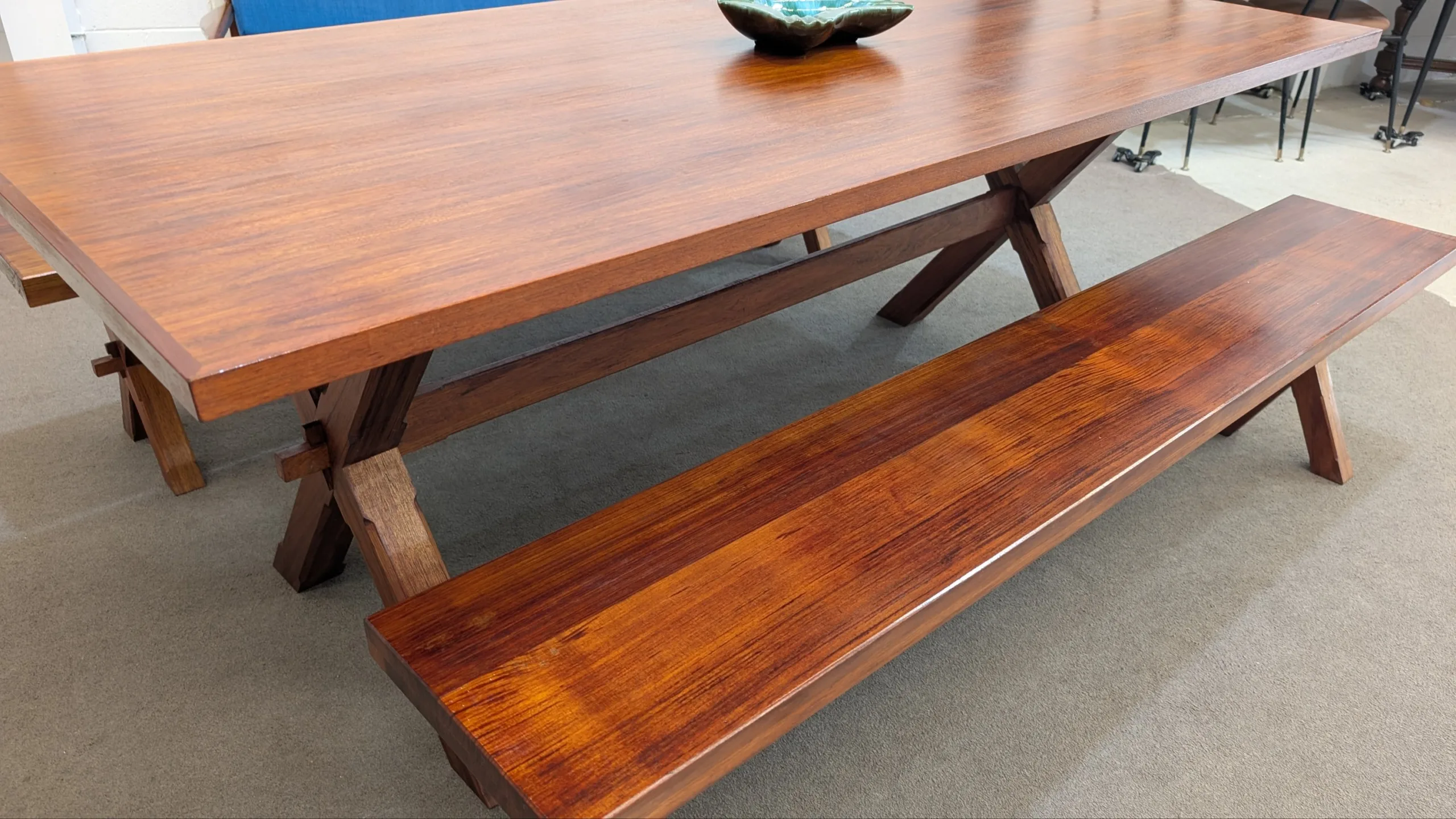 There piece timber refectory dining set in good solid condition. Well crafted using quality materials and craftsmanship. Large eight piece set. Practical design, stools tuck in neatly under table when not in use. Great visual appeal. Should compliment most spaces. Something different. All three pieces included in the listing.